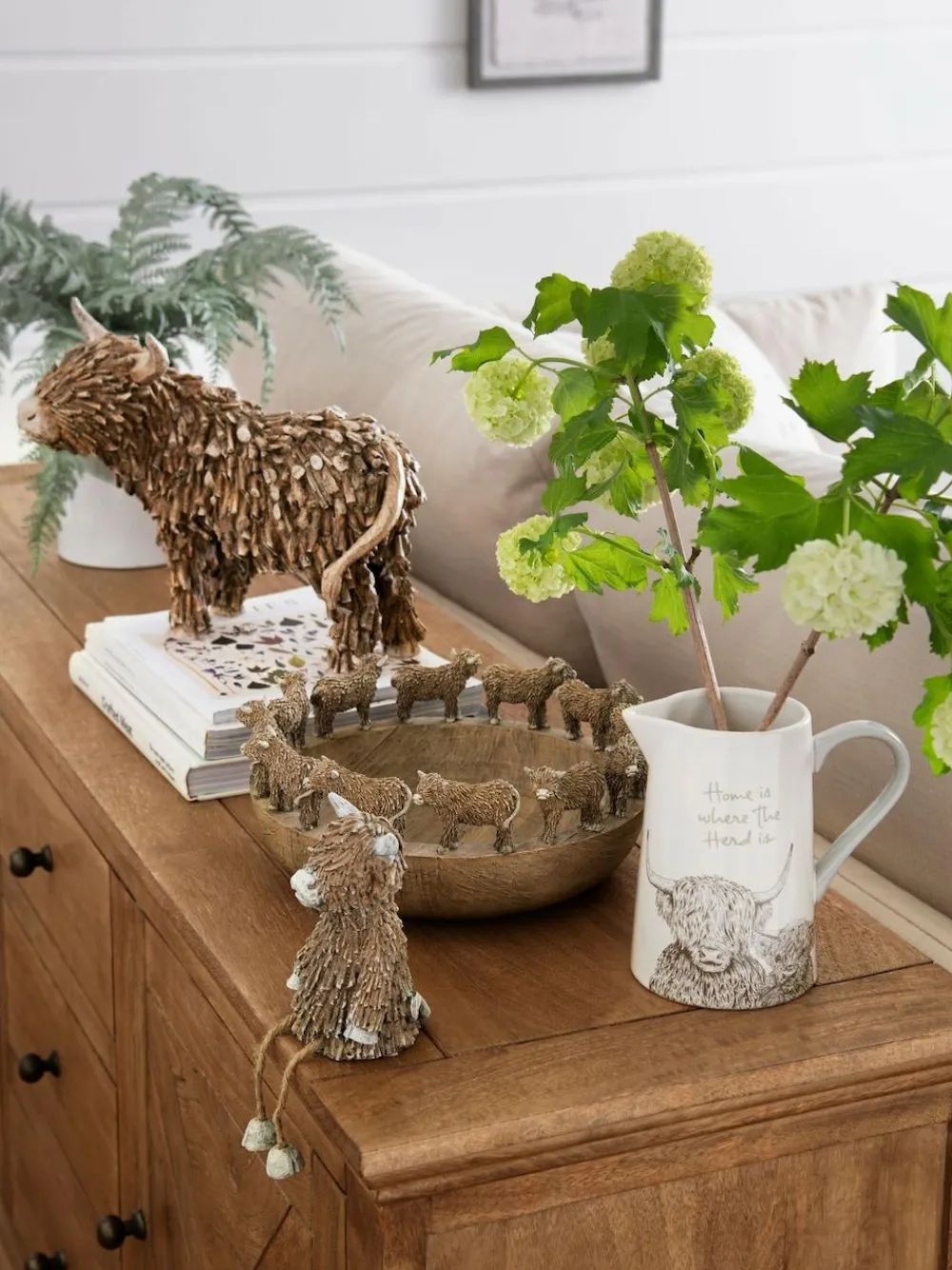 Our medium Hamish the Highland cow ornament is sure to put a smile on your face. The perfect addition to any room to add a bit of character. Made from resin in a twig effect finish. Other sizes available. Set of 3 Harnish the Highland cow ornament Resin in a twig effect finish Other sizes available Height 26cm Width 30cm Depth 18cm 100% Resin.