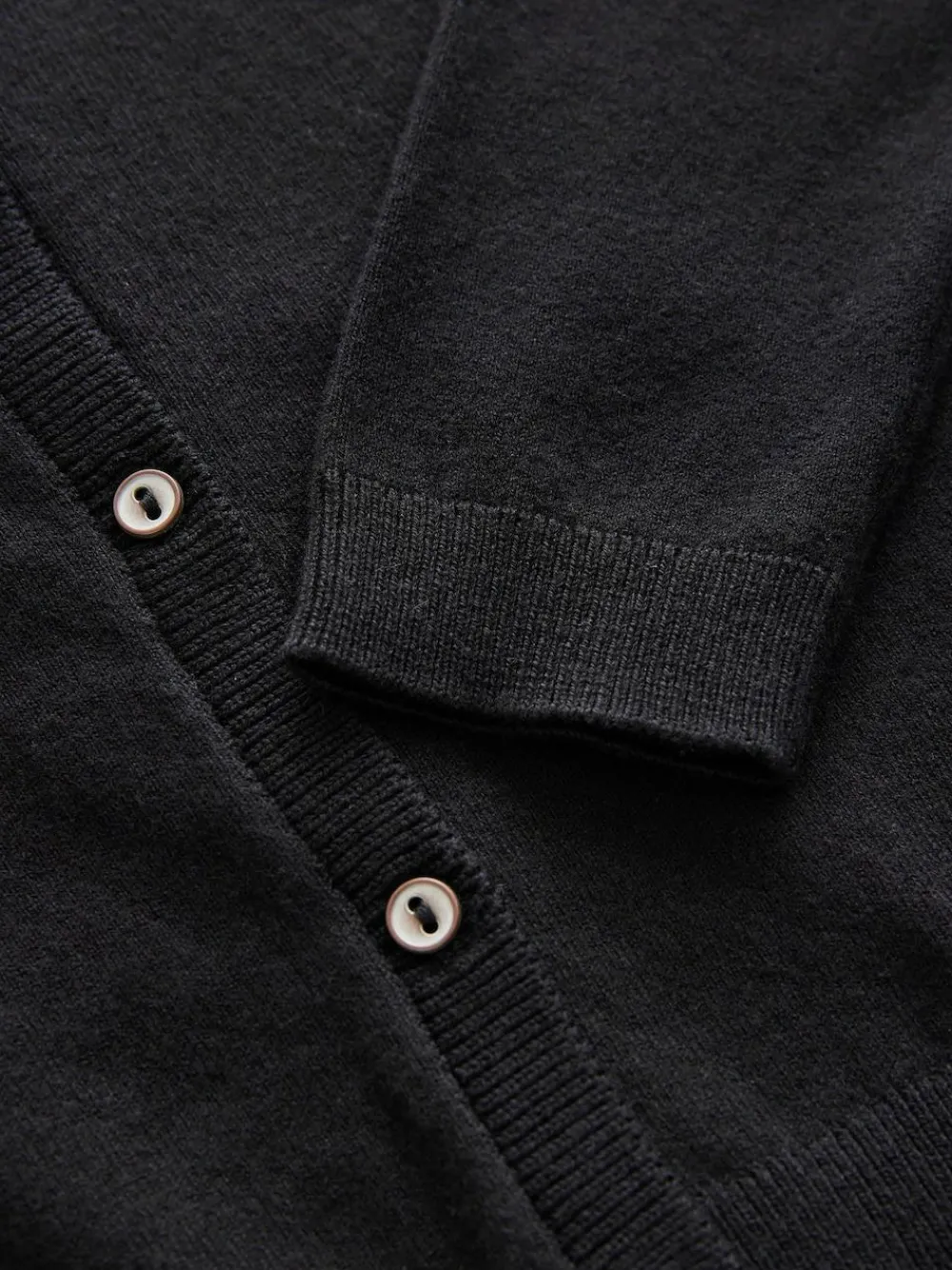 In a cotton-rich knitted fabric, this black layering staple features a button-up fastening with a round neck, ribbed sleeve cuffs and a ribbed hem. Cotton-rich fabric Knitted texture Button-up fastening Round collar Ribbed hems 80% Cotton, 17% Nylon, 3% Elastane.