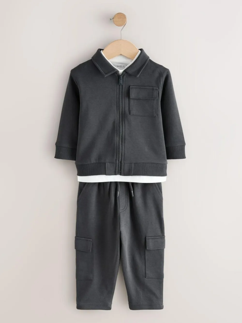 Give him an instantly polished smart casual look with this Shirt, T-Shirt And Joggers 3 Piece Set. This complete outfit includes a soft, collared overshirt that fastens easily with a popper front, featuring two stylish patch pockets to the chest. The jacket is perfectly layered over a T-shirt and paired with comfortable, matching joggers that have a drawstring waist. Ready to wear right off the hanger, this set is a simple way to achieve a cool, coordinated style. 3 piece set Popper front shirt Long sleeve t-shirt Matching joggers Machine washable. Jacket and Jogger 75% Cotton, 25% Recycled polyester. T-shirt 100% Cotton.