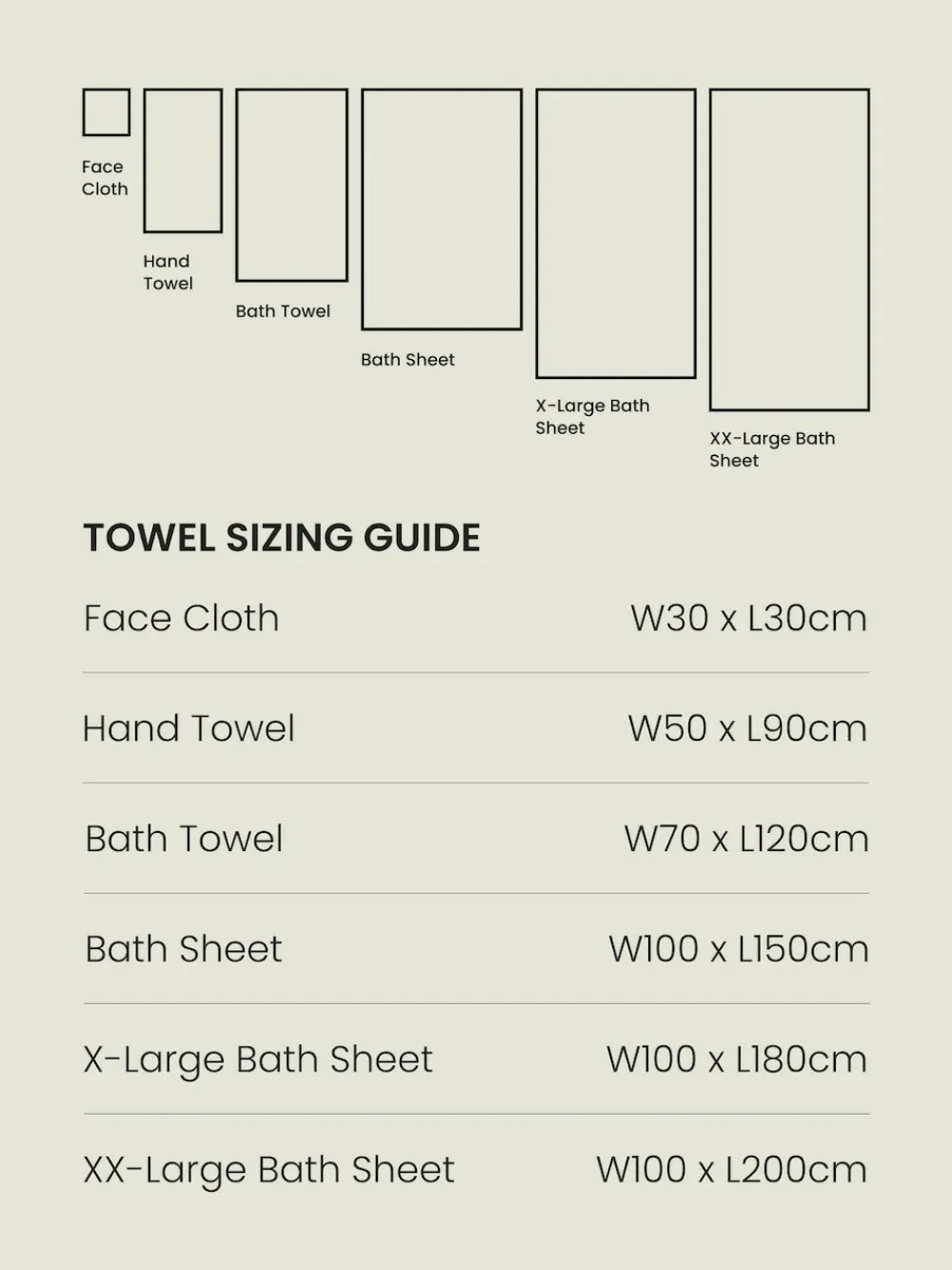 | Size | 4 pack Face Cloths, Bath Sheet, Bath Towel, Hand Towel, X-Large Bath Sheet |