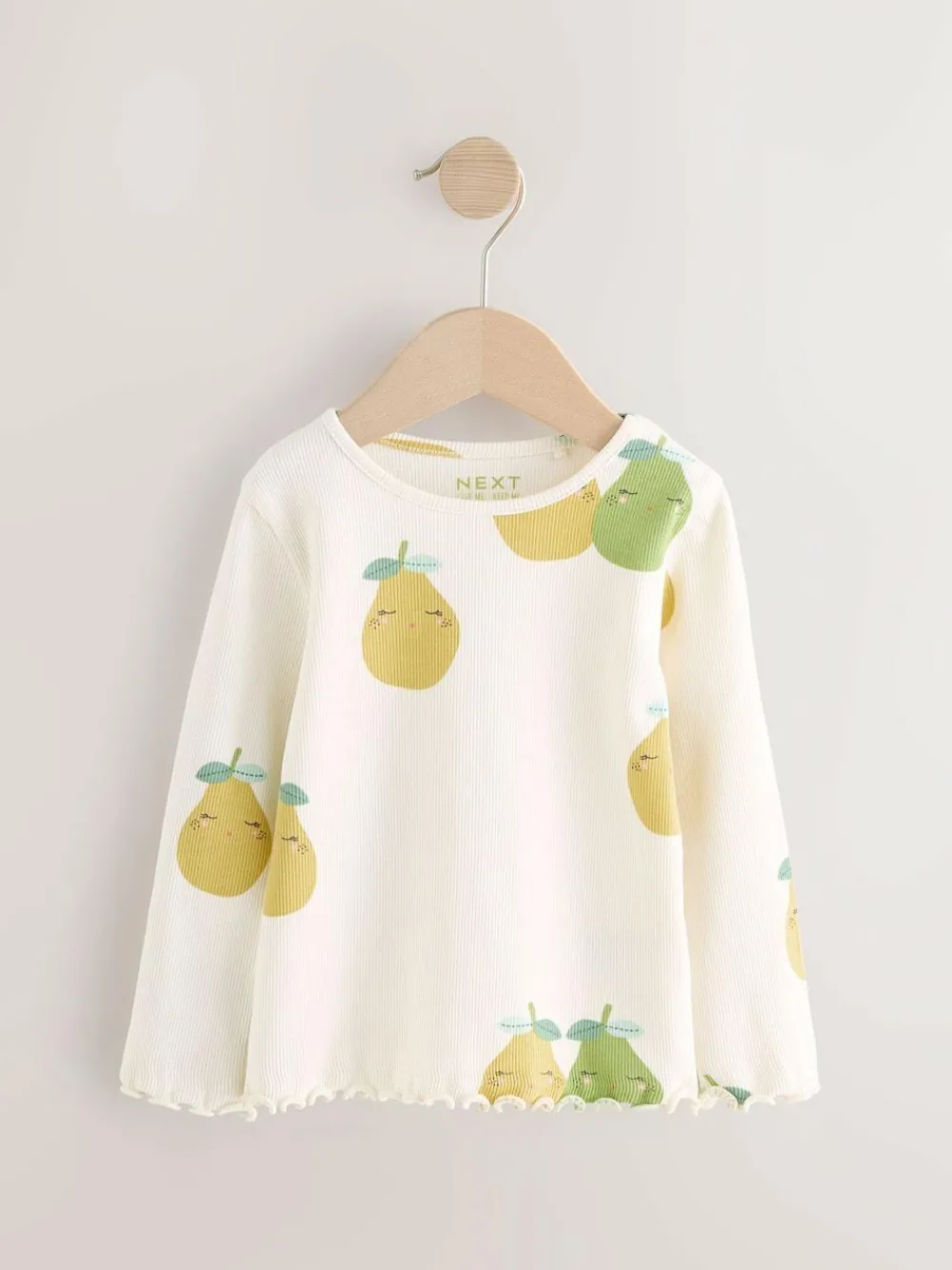 Made for layering, this 5 pack of long sleeve tops will fill out her wardrobe nicely. In a cotton rich blend with added stretch, each piece is adorned in a flower or fruit print and complete with ribbed texture and lettuce trim detailing. 5 pack Long sleeves Cotton rich Rib texture Machine washable. 5 x T-shirt 95% Cotton, 5% Elastane.