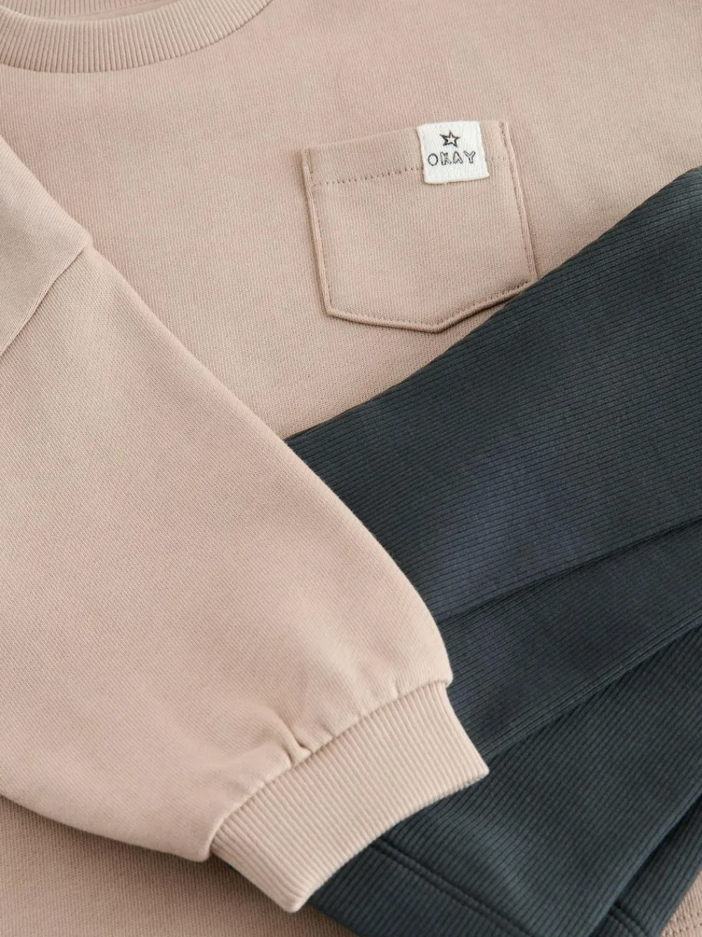 Cosy and stylish playtime awaits with this Long Sleeve Top and Leggings Set. This simple yet practical two-piece outfit features a loose-fit, long-sleeve top with a classic crew neckline and a subtle chest pocket detail accented with a small woven label. Paired with comfortable ribbed leggings, this set is designed for ease of movement and provides a soft, coordinating look perfect for everyday adventures. 2 piece set Ribbed leggings Pocket detail Machine washable. Sweater 100% Cotton. Trouser 95% Cotton, 5% Elastane.
