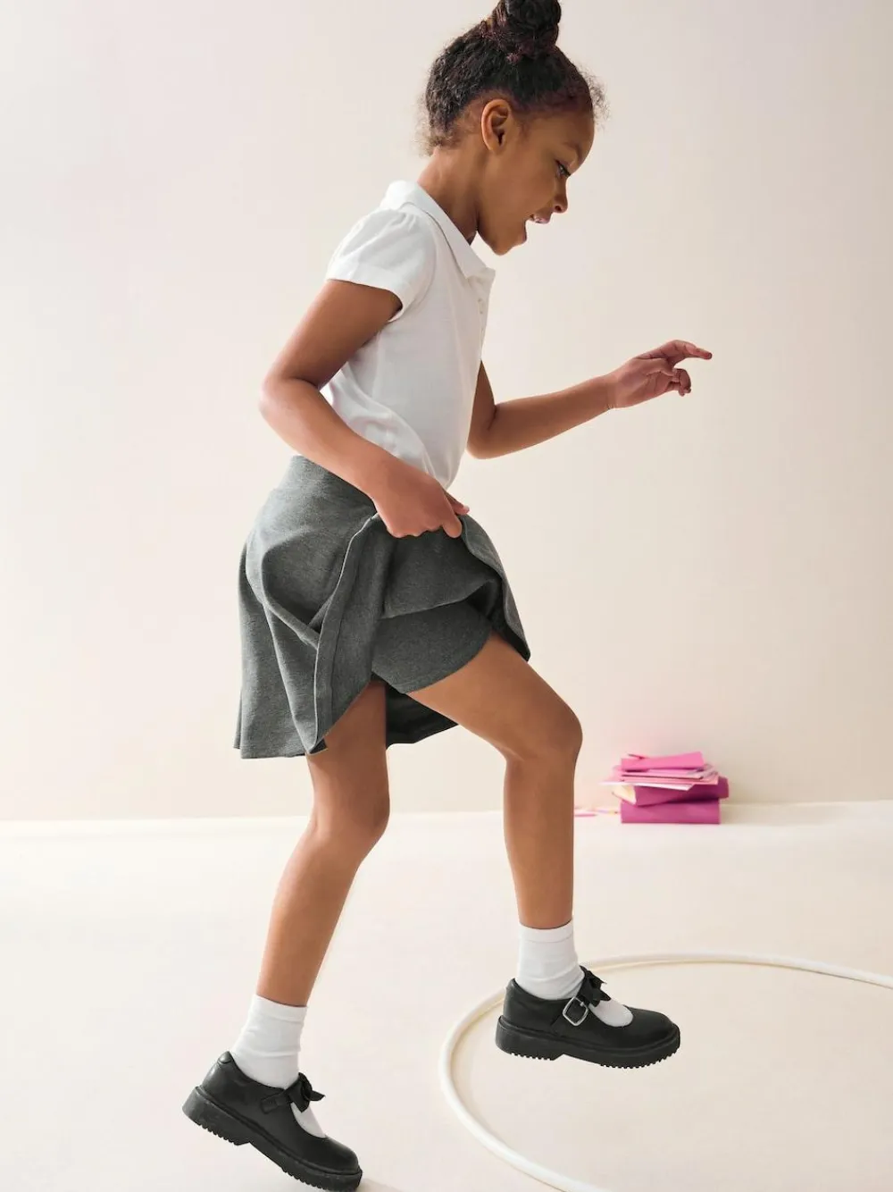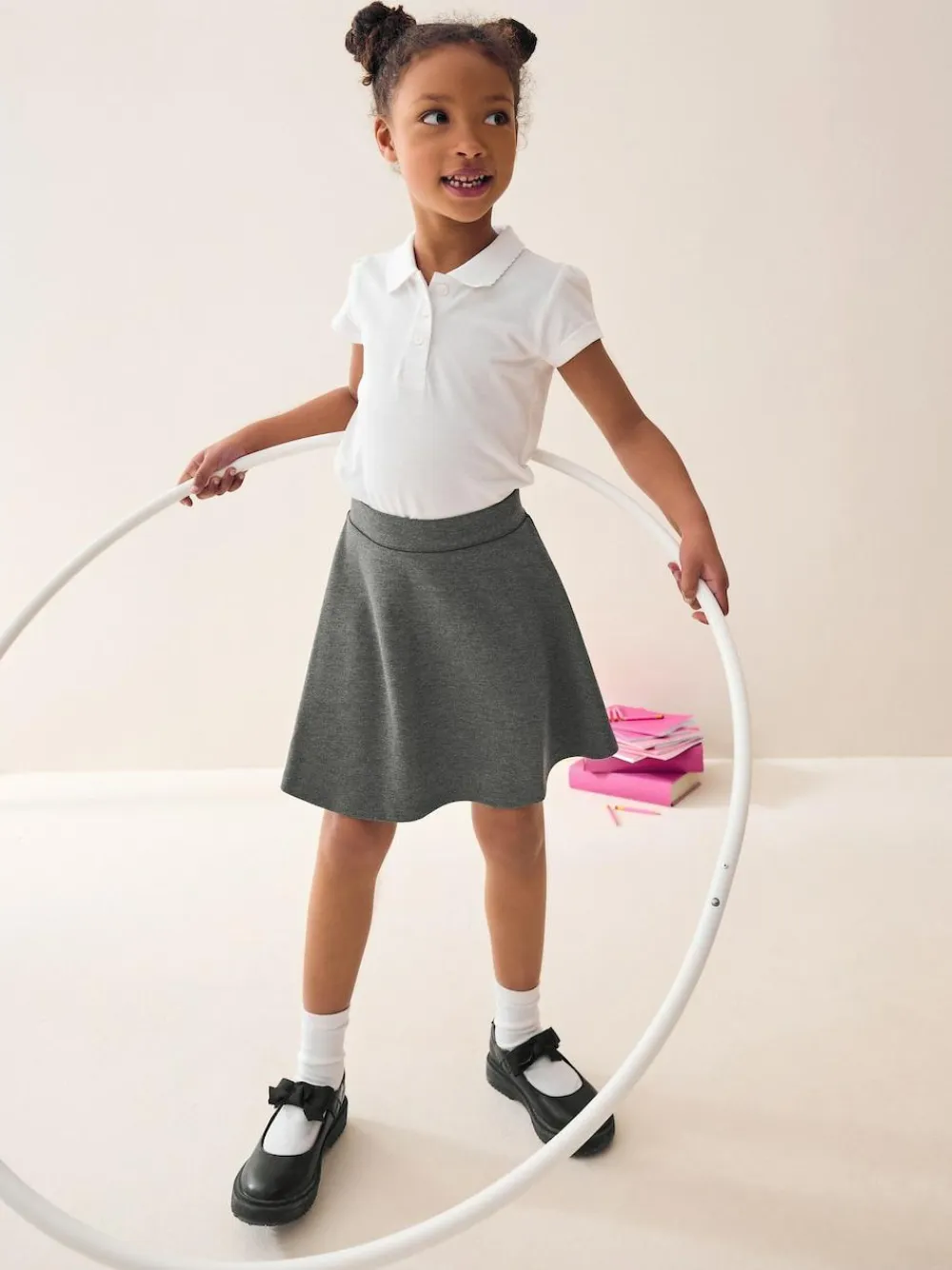 Take the stress out of school mornings with our Dressing Made Easy School Uniform Collection. Featuring pull on trousers, skirts and dresses alongside hidden touch fastenings, printed labels and elasticated waists. Getting ready for school has never been easier. The perfect addition to their school wardrobe. This skater skort is designed with stretch jersey fabric and a pull on feature for all day comfort and to make dressing in the morning super easy. For extra modesty this skort has an intergrated stretch short. Key Features: Stretchable jersey fabric Skater style skirt Integrated modesty short Pull-on style Machine washable. Skirt 72% Recycled polyester, 26% Viscose, 2% Elastane. Inner 92% Cotton, 8% Elastane.