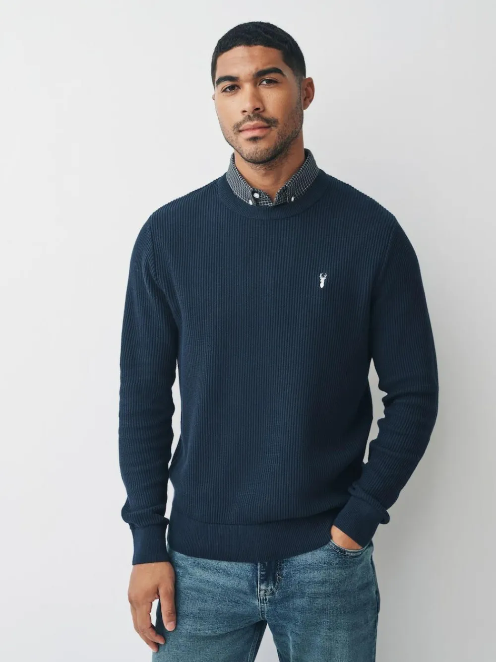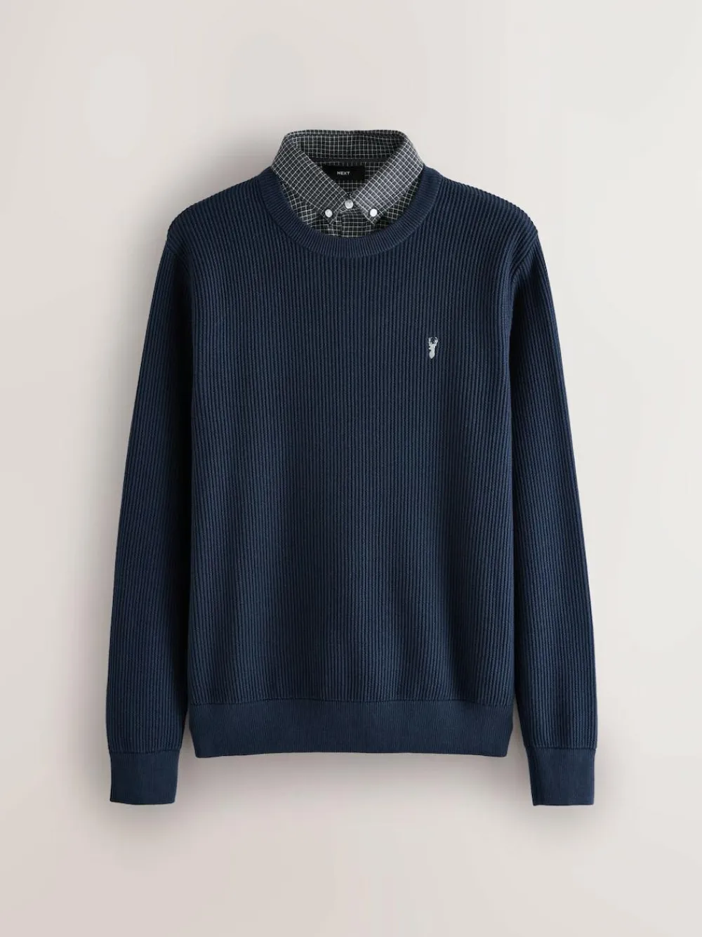 Effortlessly elevate your smart-casual wardrobe with this stylish ribbed knit jumper. Designed for a regular fit, this piece offers both comfort and a clean silhouette. The ribbed texture knit provides a contemporary feel and excellent structure, while the integrated mock Oxford shirt detail at the neckline creates the perfect sophisticated layered look. Simply pull it on for instant polished style. Comfortable regular fit Ribbed texture knit crew neck jumper Mock Oxford shirt collar insert Available in standard sizes Best for smart-casual wear Machine washable. Main 100% Cotton. Collar 100% Cotton.