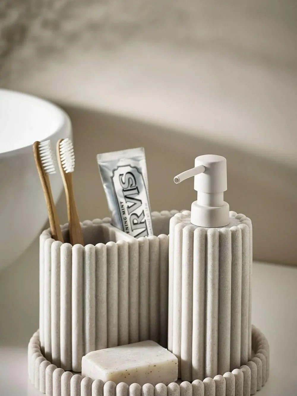 Our natural round tray is a small but nifty piece of storage. With a textured rib finish, it makes an attractive addition anywhere in your home. Whether it’s for the soap in the bathroom or for the jewellery on your dresser, use it organise your favourite little bits and bobs in style. Inspired by clean, Scandinavian design elements, it’s a neat little solution to keep everything in check. Width 21cm Depth 21cm 100% Resin. This item has been tested to ensure it is bathroom suitable and protects against corrosion and distortion from steam.