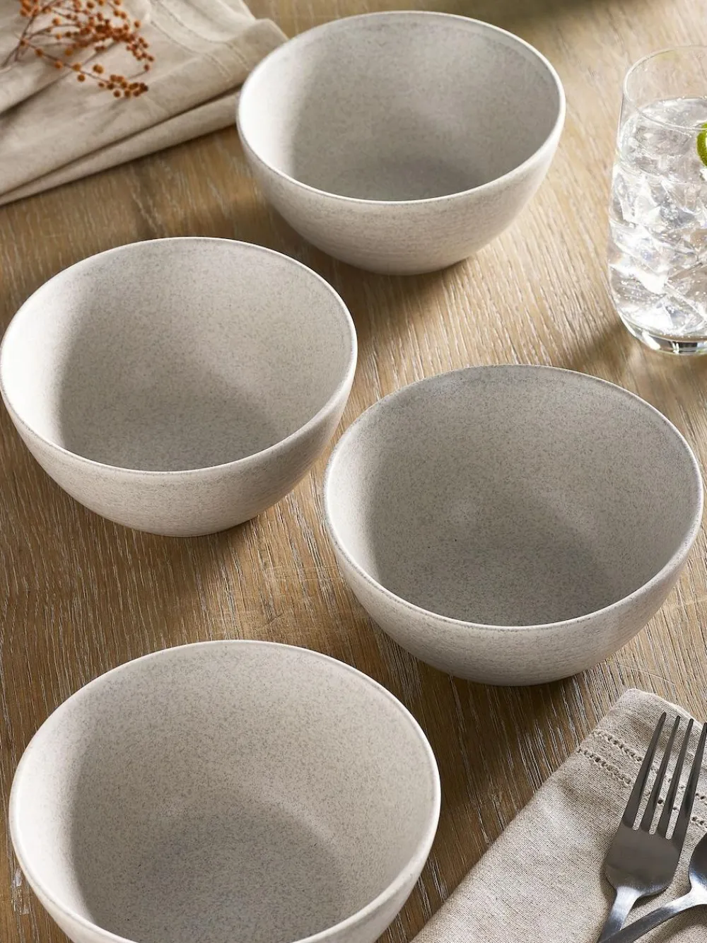 Our set of 4 Kya bowls feature a beautiful soft natural matte glaze on a spun embossed texture with a subtle speckle finish. These bowls are a kitchen cupboard staple and will make a great addition to your dinnerware collection. Made from durable stoneware which is known for its practical and long-lasting qualities.Bowl height 7cm, bowl diamter 15.5cm. Height 7cm Width 15.5cm 4 x Bowl 100% Stoneware. Dishwasher safe, microwaveable.