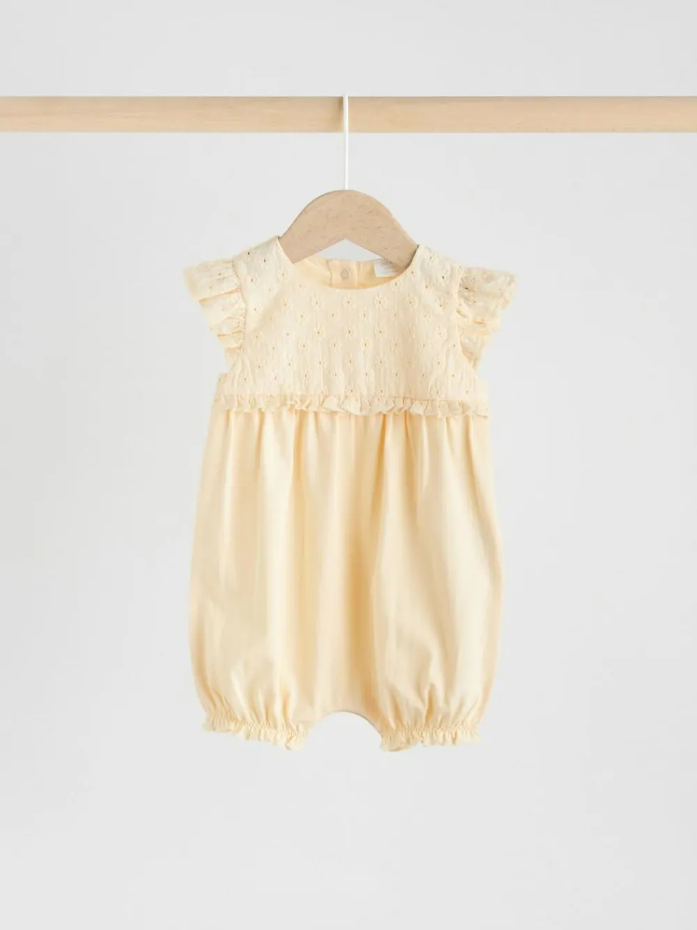 This beautiful Pink Broderie 3 Pack Baby Rompers set offers charming style and comfort for everyday wear. Each romper features delicate Broderie front and shoulder detail for an intricate, premium look. Designed for fuss-free changes, they include a practical popper back neck opening and a neat woven side tab. Broderie front and shoulder detail Woven side tab Popper back neck opening 3 Pack Rompers Machine washable. 3 x Romper Main 100% Cotton. Yoke 100% Cotton. Warning: Keep away from fire and flames.