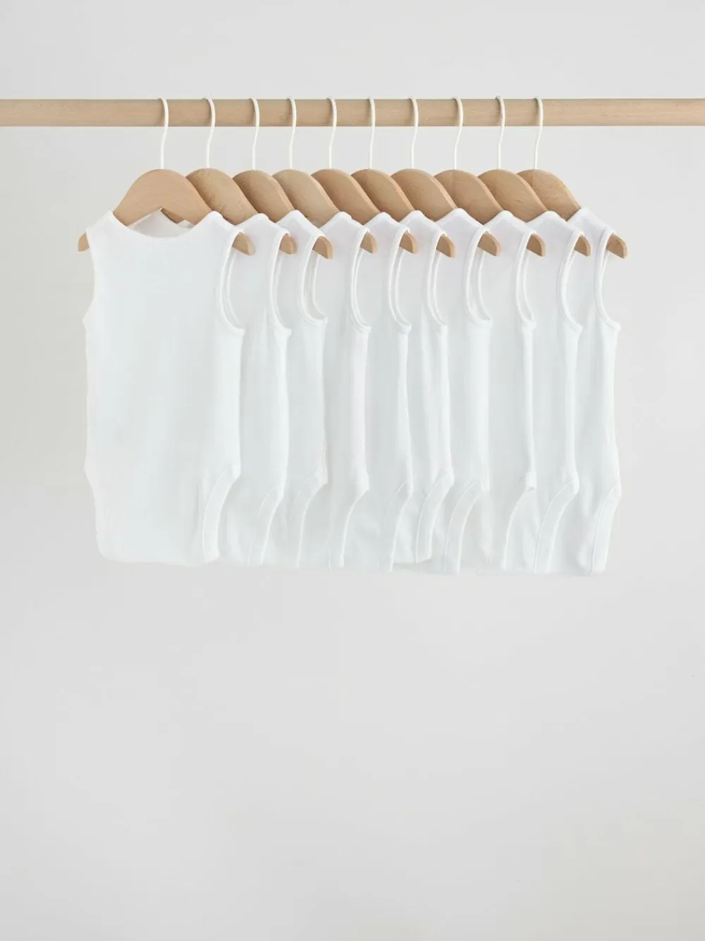 Stock up on essentials with our classic multipack of white baby vests. Made from soft and breathable cotton, the five packs each boast the same round neck design and feature nickel-free popper fastenings, and printed neck labels to avoid irritation they are free from harmful dyes and chemicals, making them safe for baby and gentle against their delicate skin. Machine washable. 10 x Bodysuit 100% Cotton. Warning: Keep away from fire and flames.