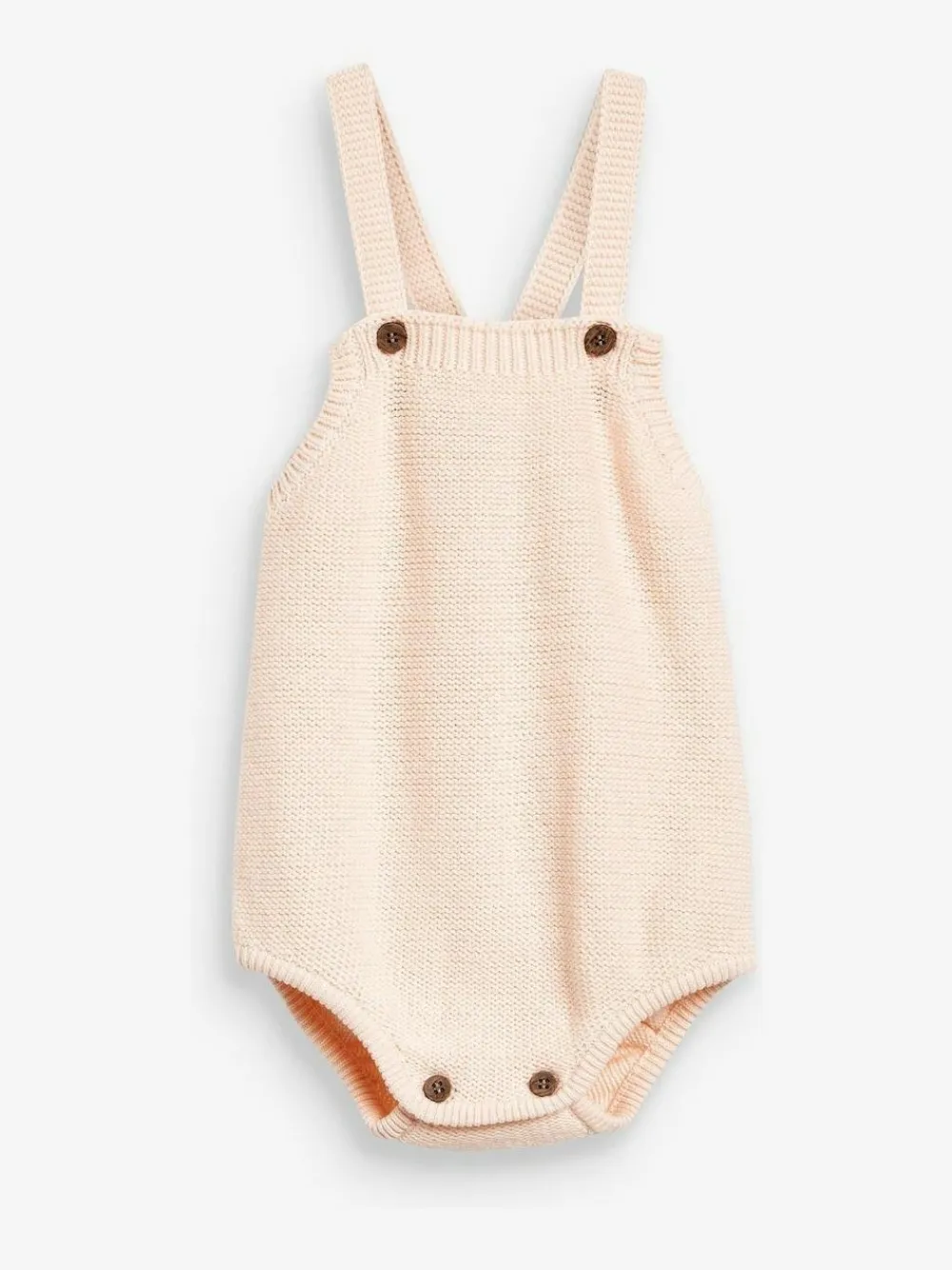 A super cute and stylish knitted romper, it features button straps and popper leg openings for easy dressing. Made from 100% cotton. 100% Cotton.