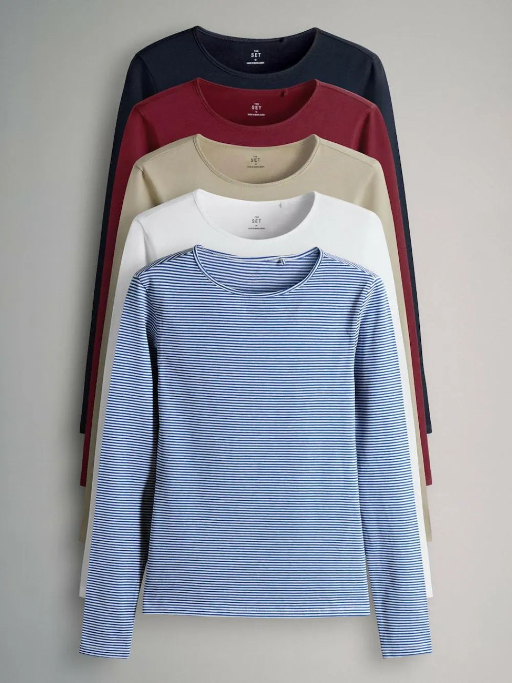 Be the first to review “Outlet The Set 5 Pack Long Sleeve Crew Neck T-Shirts Navy/Light Blue Stripe/Red/Stone Brown/White” Cancel reply