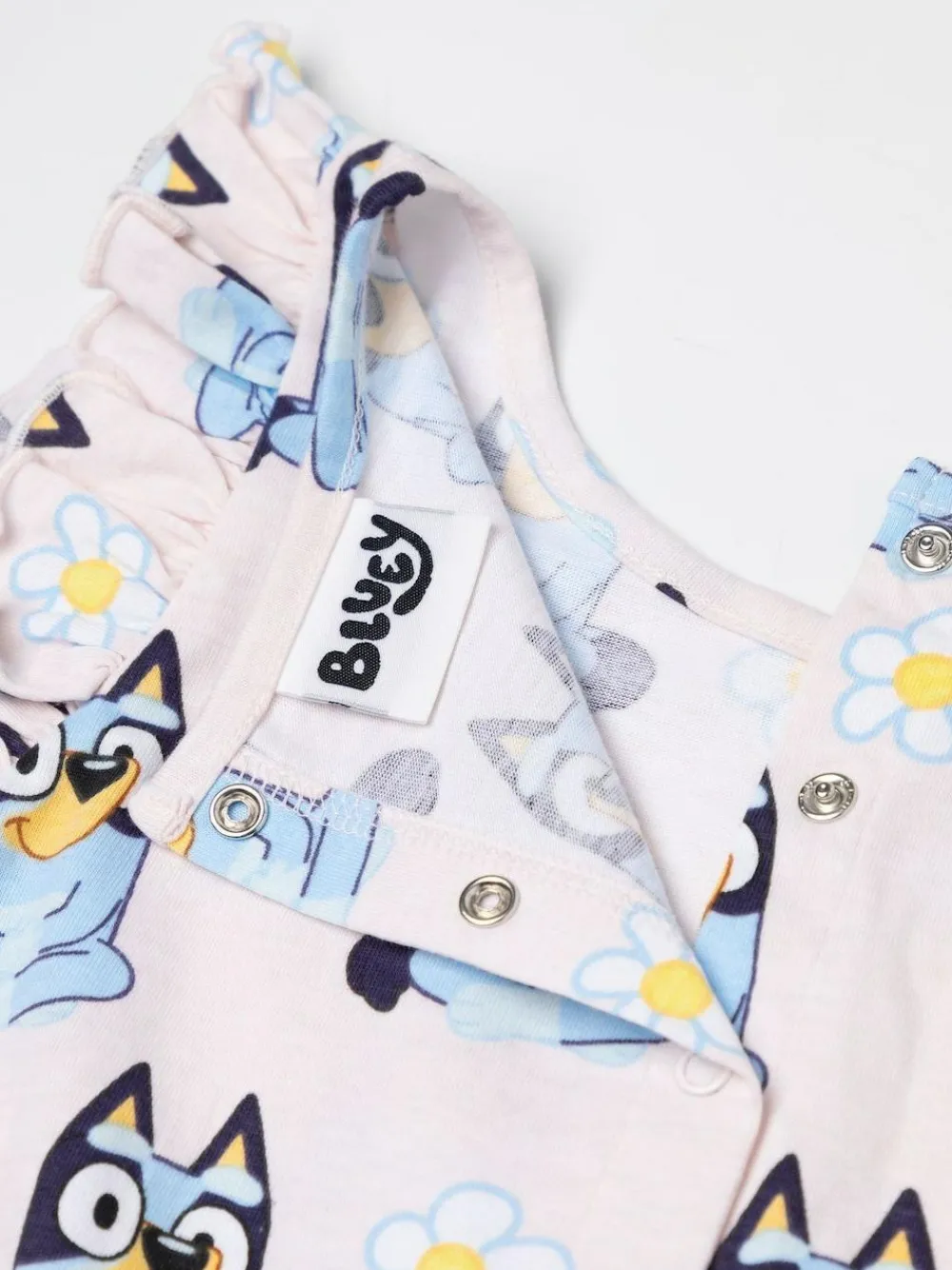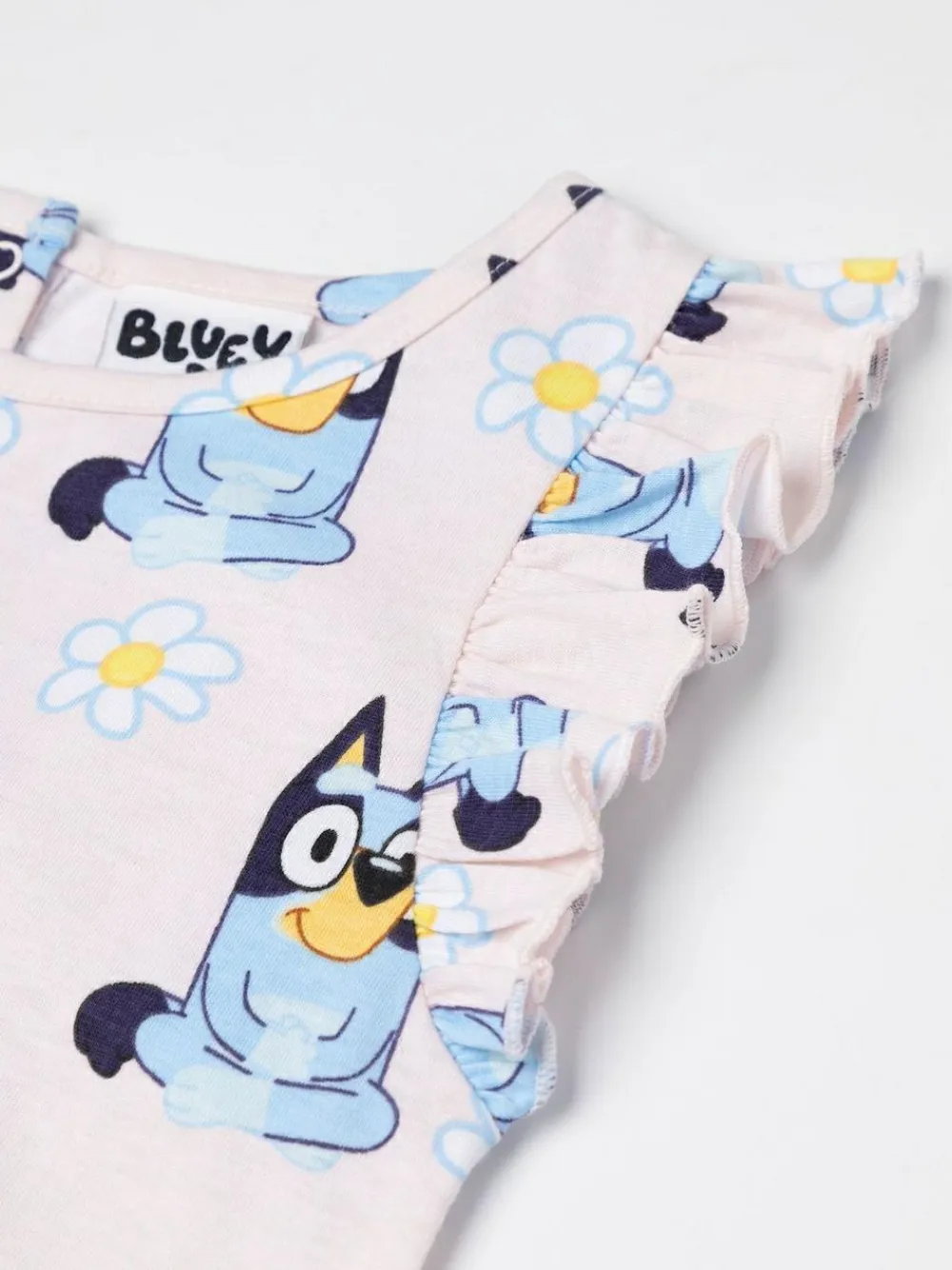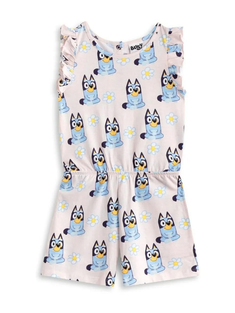 Dress your little one in playful comfort with the Bluey Girls Pink Character AOP Sleeveless Playsuit. This adorable outfit is perfect for sunny adventures and spirited play. Machine washable. 100% Cotton. Warning: Keep away from fire and flames.