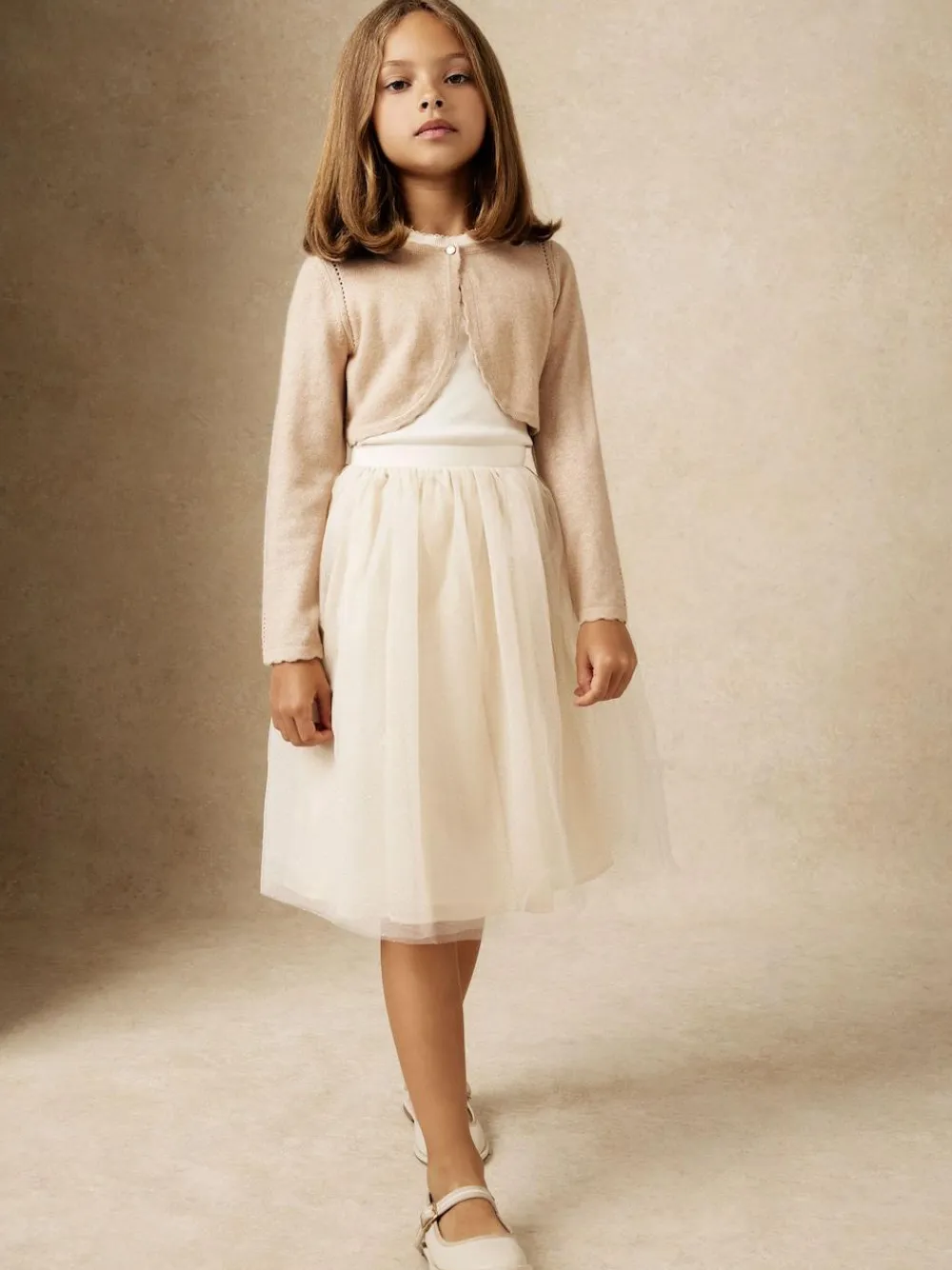 The gold Abi cardigan is the perfect occasion layer, knitted from a super-soft wool-blend with metallic threads that subtly catch the light. The bolero-style silhouette is elevated by decorative open-knit details and charming scalloped edges. Wool-blend Metallic thread Open-knit detailing Scalloped edges Single-button closure Machine washable. 42% Wool, 32% Viscose, 10% Polyester, 9% Nylon, 4% Cashmere, 3% Metallised fibre.