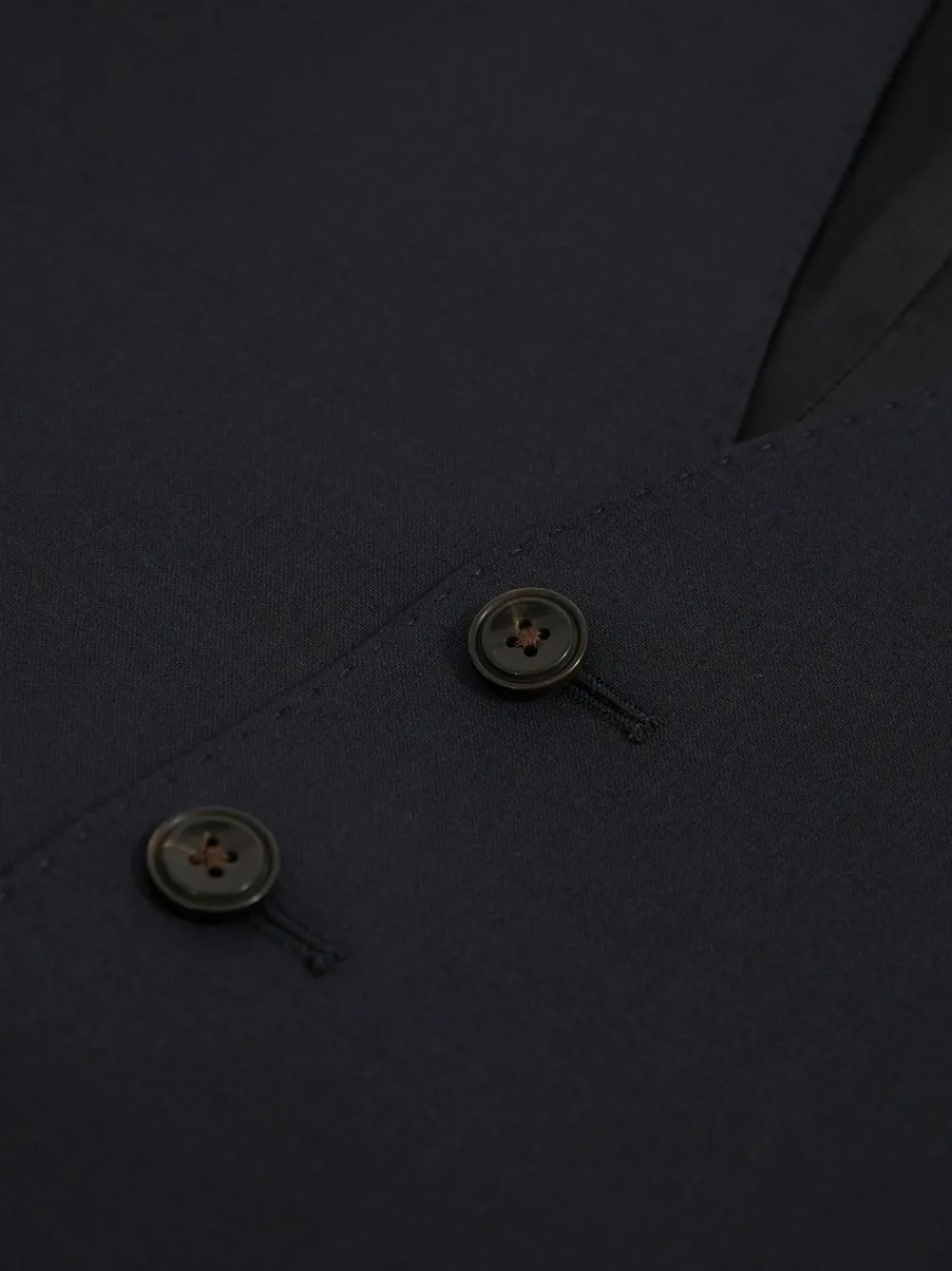 The Navy Promise waistcoat is crafted from a refined wool-blend in a plain weave, offering a sleek, slim fit. The single-breasted design is complemented by two welt pockets and an adjustable strap at the back. Wool blend Single-breasted Welt pockets Adjustable strap to reverse Front buttons The model is wearing a size 38.Measurements of model: Height 6ft 2.5” / 189cm. Dry clean only. 55% Wool, 41% Polyester, 4% Elastane.