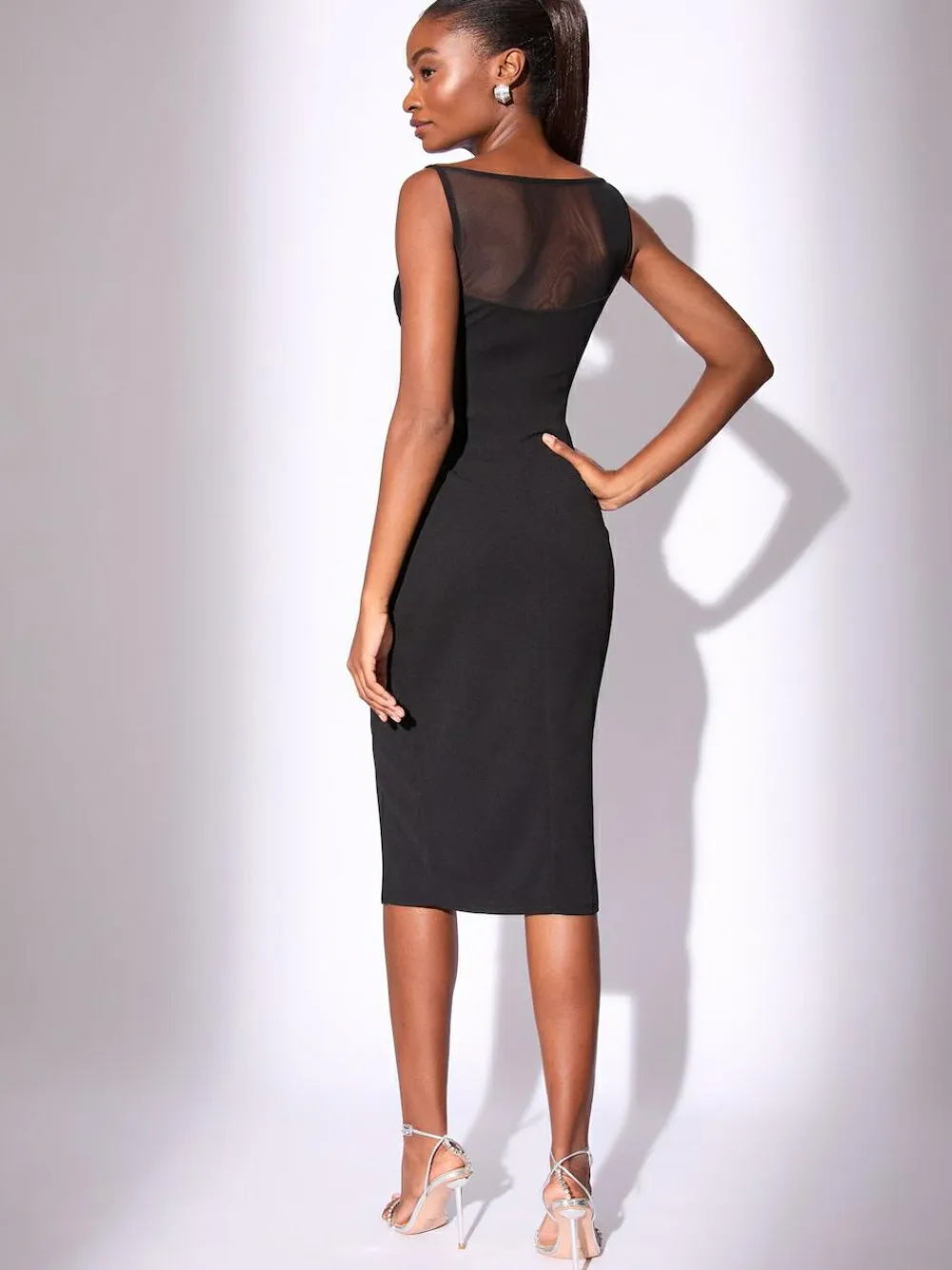 Achieve sophisticated glamour in this sleek sleeveless bodycon midi dress. Crafted from sculpting scuba fabric, the figure-flattering silhouette features a daring side split and elegant mesh yoke detail at the neckline. Perfect for day to night transitions, this dress is essential occasionwear for dinner dates and formal events. Mesh yoke detail Sculpting scuba fabric Sleeveless bodycon fit Midi length with side split Occasionwear Main 96% Polyester, 4% Elastane. Mesh 92% Polyester, 8% Elastane. Lining 100% Polyester.