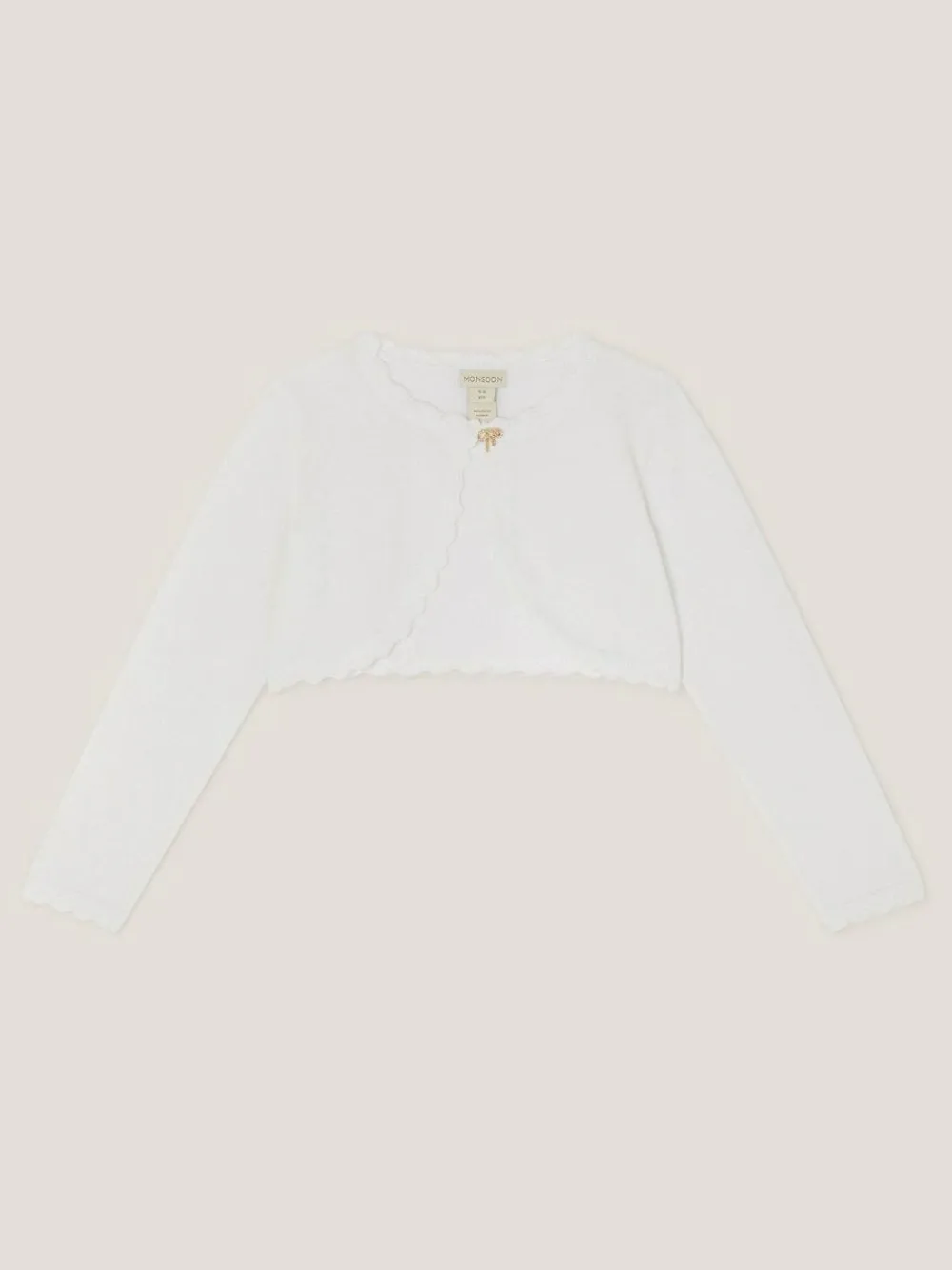 Take a bow. A cosy cute layer for all their party dresses, this cropped cardigan is designed with pointelle hems and a gold-tone bow button at the neckline. Machine washable. 70% Cotton, 17% Polyester, 13% Nylon.