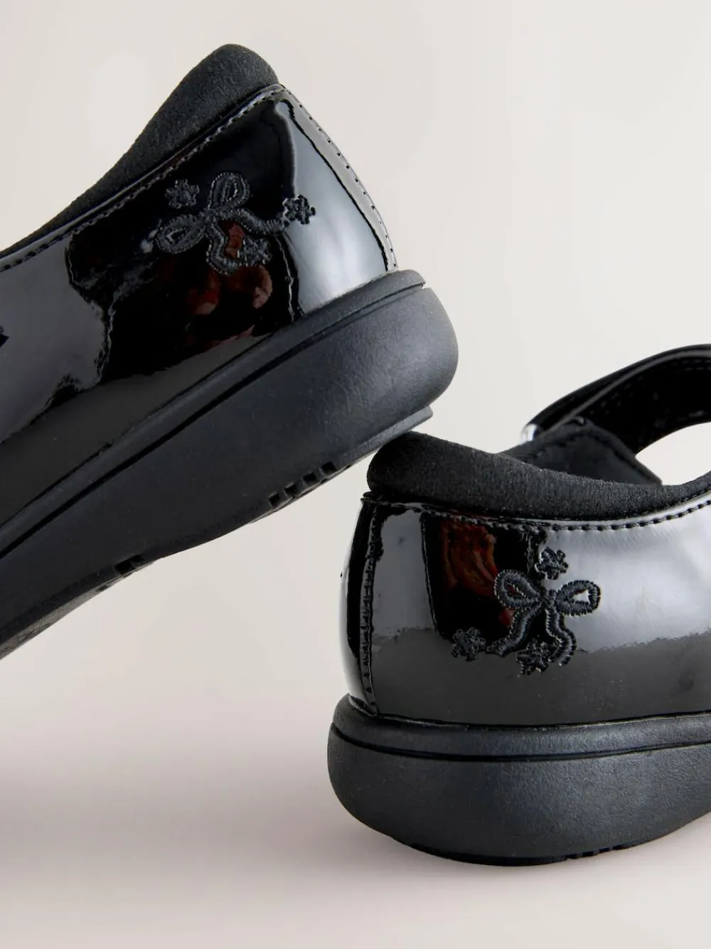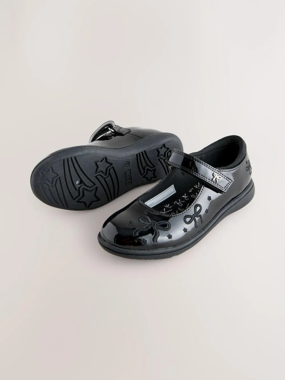 These Mary Jane school shoes are perfect for term time, featuring a scuff-resistant and shiny patent upper with bow and star stitching, a touch-fastened strap with metal bow detail and a cushioned foam footbed, a Micro fresh treated lining to fight odour causing bacteria and a durable outsole. Patent upper Touch-fastened strap Stitched detailing Cushioned footbed *Micro fresh treated linings to fight odour causing bacteria – contains the biocide silver chloride Upper – Other Materials, Textile, Lining & Sock – Textile, Sole – Other Materials.