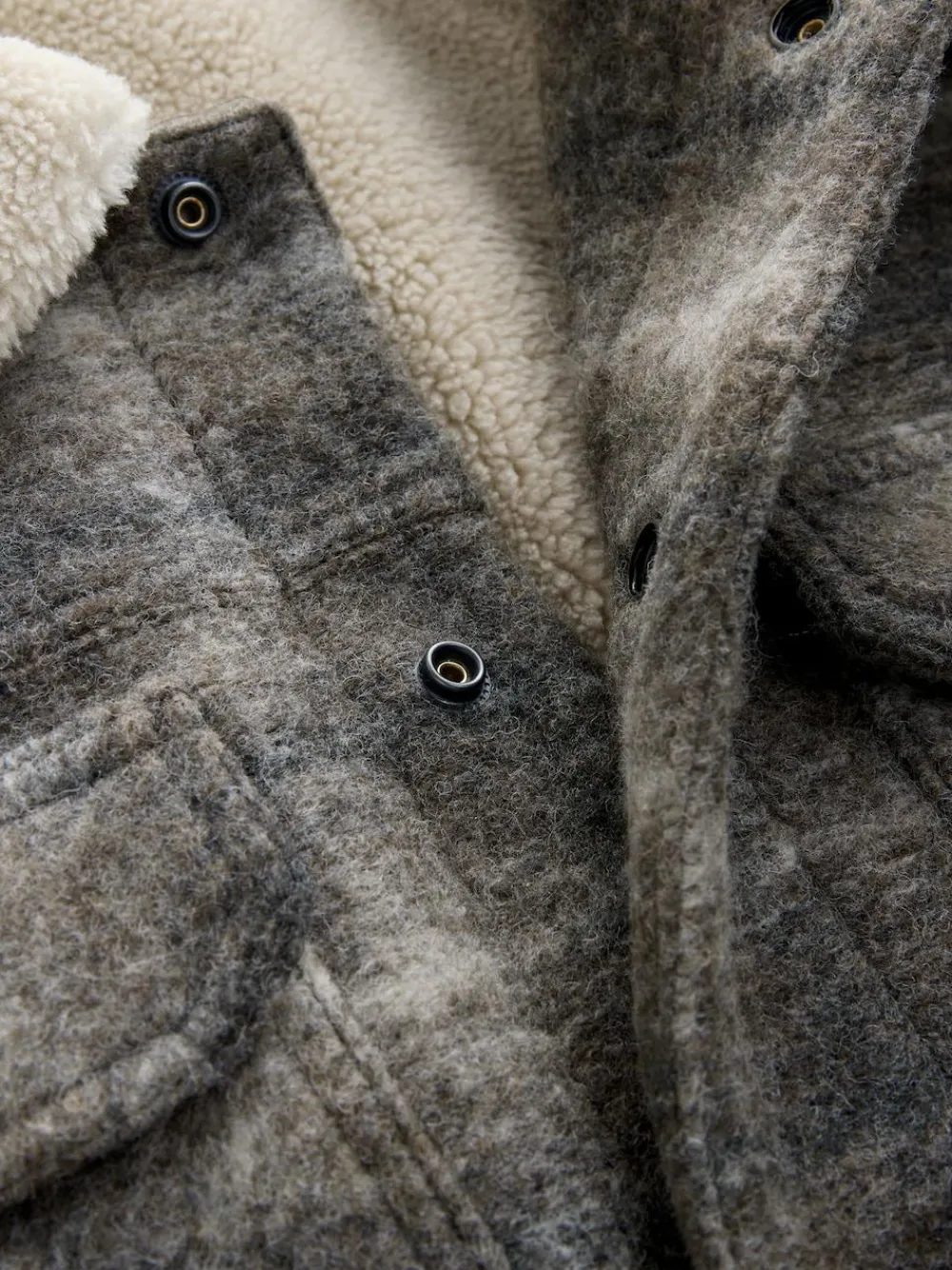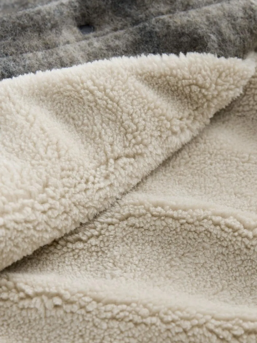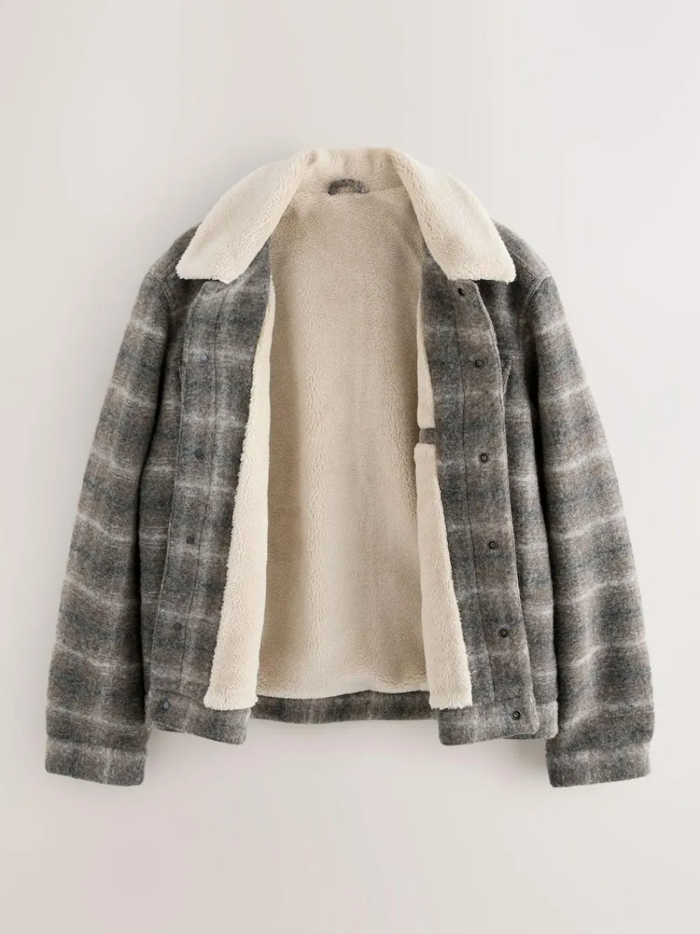Cosy up in this borg-lined trucker jacket with a check pattern; the perfect blend of warmth and classic style. The soft wool-blend outer and comfortable borg lining make it ideal for layering in cooler weather. Complete with button fastenings and practical pockets, it’s a stylish and functional choice. Wool blend Borg lining Button fastening Two chest pockets Internal pocket Shell 70% Recycled polyester, 30% Wool. Body Lining 100% Polyester. Sleeve Lining 100% Recycled polyester. Wadding 100% Recycled polyester.