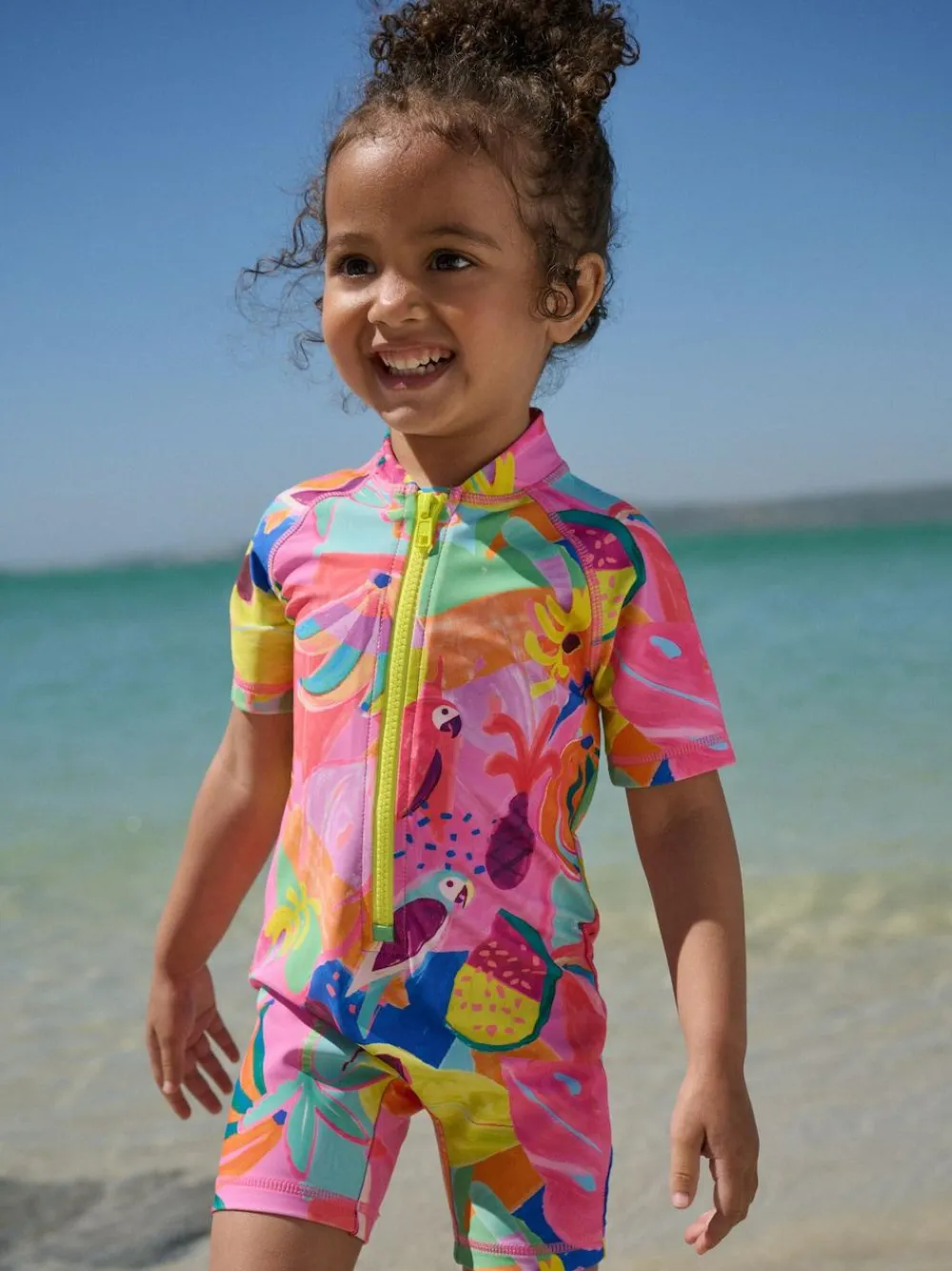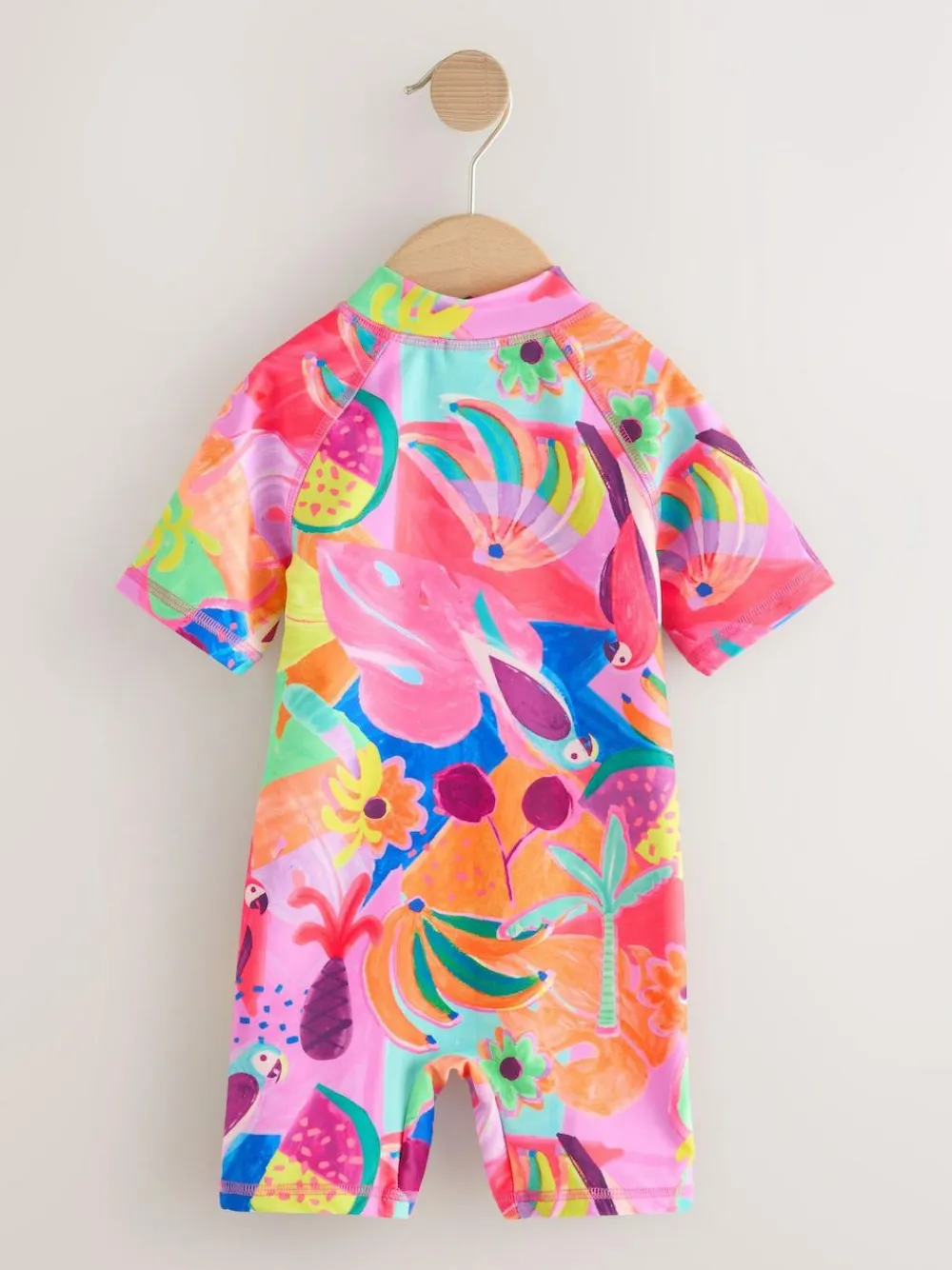 Available in a selection of quirky prints and fun colours, this short sleeve swimsuit is made from a sunsafe and stretchy fabric with a UPF rating of 50+, with a zip fastening for easy dressing, a tall collar and raglan sleeves. Stretchy fabric UPF rating of 50+ Zip fastening Tall collar Short sleeves Machine washable. Main 82% Recycled polyester, 18% Elastane. Lining 92% Recycled polyester, 8% Elastane. This fabric will provide protection against solar ultraviolet radiation. It has been independently tested and given a UPF rating of 50+ which blocks more than 97.5% of UV rays. Important Advice: • Sun exposure causes skin damage • Only covered areas are protected • Always use a high protection factor sunscreen on any exposed areas of skin • The protection offered by this fabric may be reduced with use or if stretched or wet • Always rinse in fresh water after each use • Young children should be kept in the shade between 11 and 3 • Don’t forget your hat and sunglasses. • Fabric provides UVA +UVB protection from the sun.