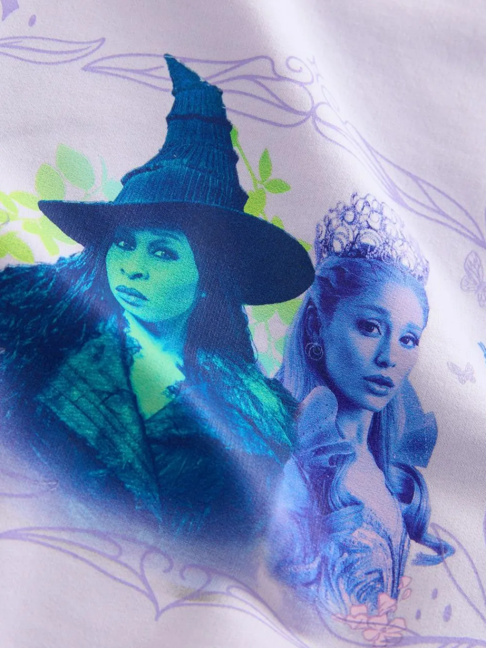 A relaxed fit and fun graphic design defines the Purple Wicked Long Sleeve Sweat Top. This cosy piece features a classic crew neck and long sleeves with a subtle bubble hem and cuffs. The light purple colour is the backdrop for a graphic print W on the chest. The back of the top showcases a large graphic print of the main characters, Elphaba and Glinda, in a stylised frame. Crew neck Wicked graphic Relaxed fit Bubble hem and cuffs 100% Cotton.