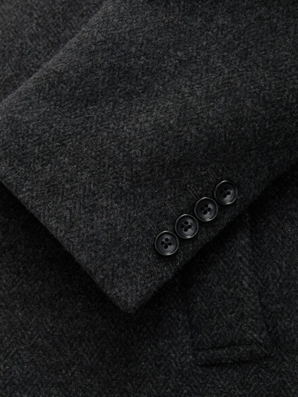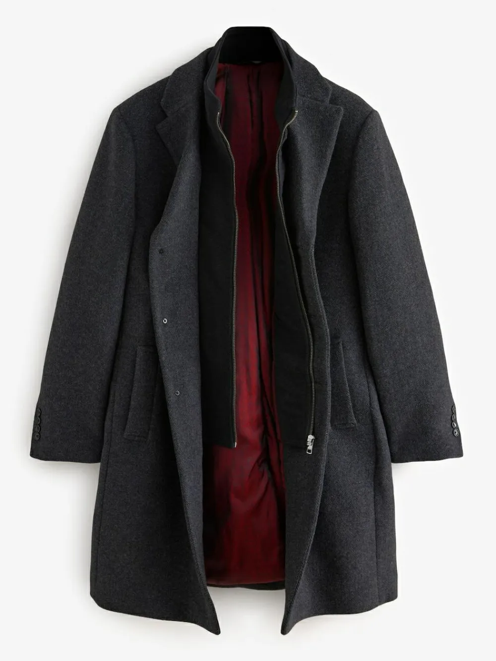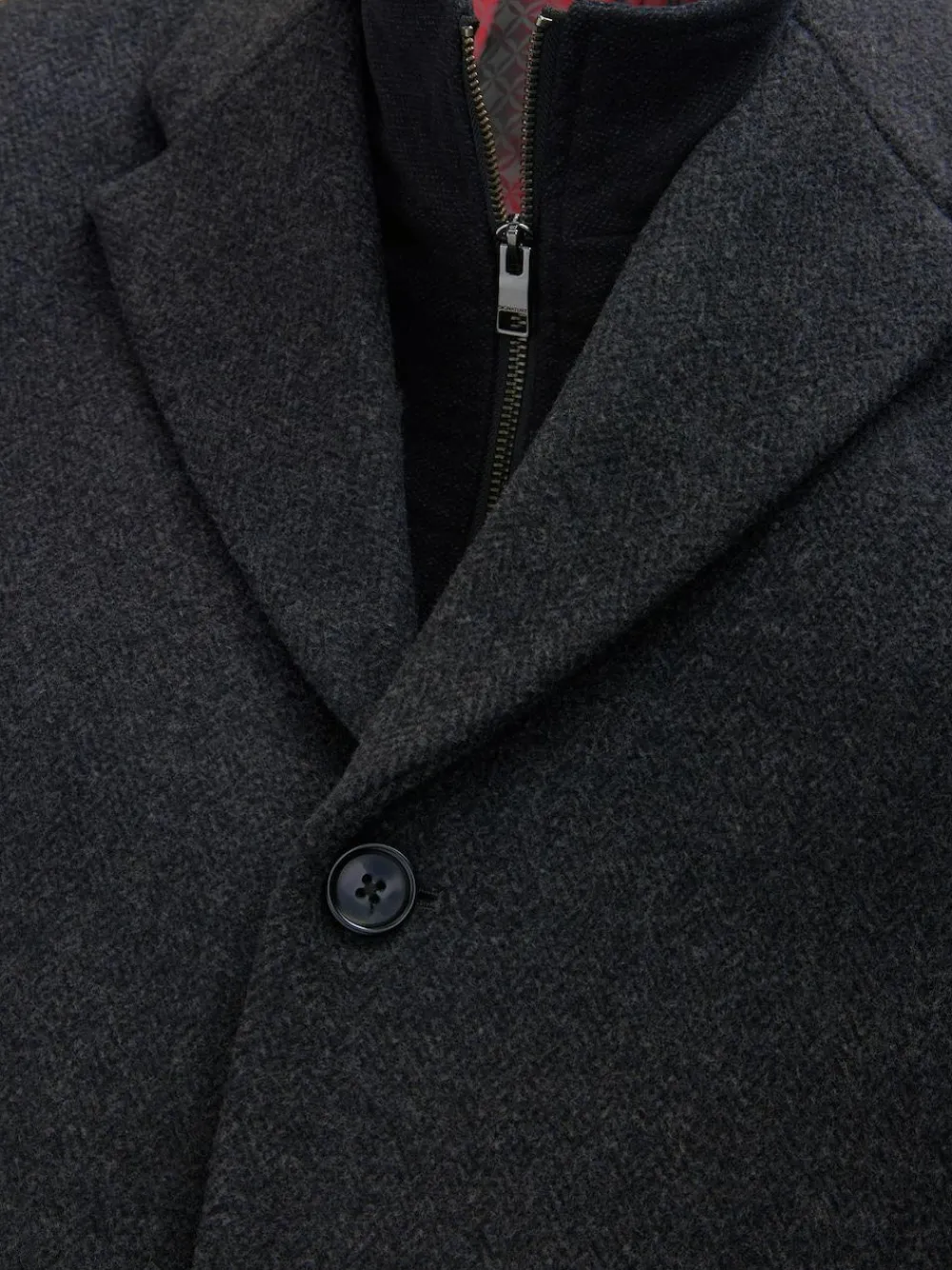 As part of our Signature selection, this stylish and smart-look charcoal grey coat is made from a wool-blend fabric with textiles from the Nova Fides Italian mill, with a textured moleskin zip mock gilet for a layered look. The coat is finished with a notched lapel collar, side pockets, a smooth lining and 3M insulated padding.Nova FidesSince the 1960s, Nova Fides has been based in the Prato textile district creating fine weaves and fabrics for Men’s clothing. Signature collection Wool-blend fabric Textiles from the Nova Fides mill Moleskin zip mock gilet Button-up fastening Notched lapel collar Smooth lining Side pockets Dry clean only. Main 57% Wool, 26% Nylon, 8% Cashmere, 5% Acrylic, 4% Other fibres. Body Lining 57% Polyester, 43% Viscose. Sleeve Lining 100% Polyester. Insert 94% Cotton, 6% Polyester. Wadding 78% Recycled polyester, 22% Polyester. 3M Thinsulate Insulation – Lightweight, warm, moisture resistant and breathable. Hypoallergenic and designed to maintain warmth.