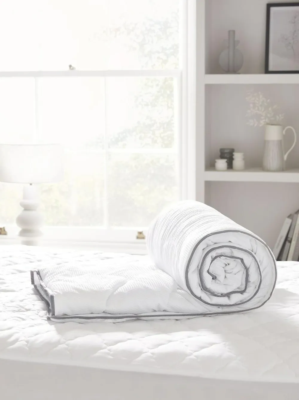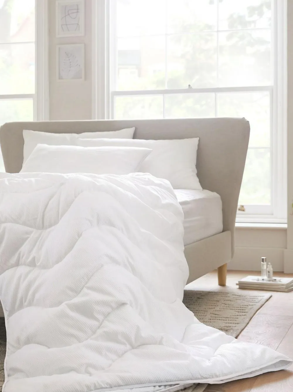 Sleep In Silk Range Immerse yourself in sleep with our touch of silk duvet, offering the ideal mix of comfort with a lightweight feel. With a hint of natural silk blended in, this duvet is as soft as a cloud, and its seersucker detail adds an extra point of interest to your bedding. Available in a range of togs to suit your needs. Key Features: 4.5 Tog Duvet Silk Feel Product Dimensions: Single: 135 x 200cm Double: 200 x 200cm King: 230 x 220cm Superking: 260 x 220cm Tog ratings: 3 Tog: Suitable for warm summer nights 4.5 Tog: Suitable for summer nights 7.5 Tog: Suitable for spring & summer 10.5 Tog: Suitable for all year round 13.5 Tog: Suitable for cold winter nights 15 Tog: Suitable for cold winter nights For top tips on choosing the best duvets and pillows for you read our handy guide here. Machine washable. Cover 100% Recycled polyester. Filling 95% Recycled polyester, 5% Silk.