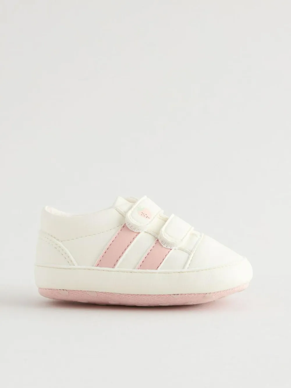 This pair of White and Pink Touch Fasten Baby Trainers is an ideal everyday trainer for your little one. They feature a convenient touch and close fastening strap, making them easy to put on and take off. Everyday trainer Touch and Close fastening Pink stripe details Soft sole Upper – Other Materials, Lining & Sock – Textile, Sole – Textile, Other Materials.