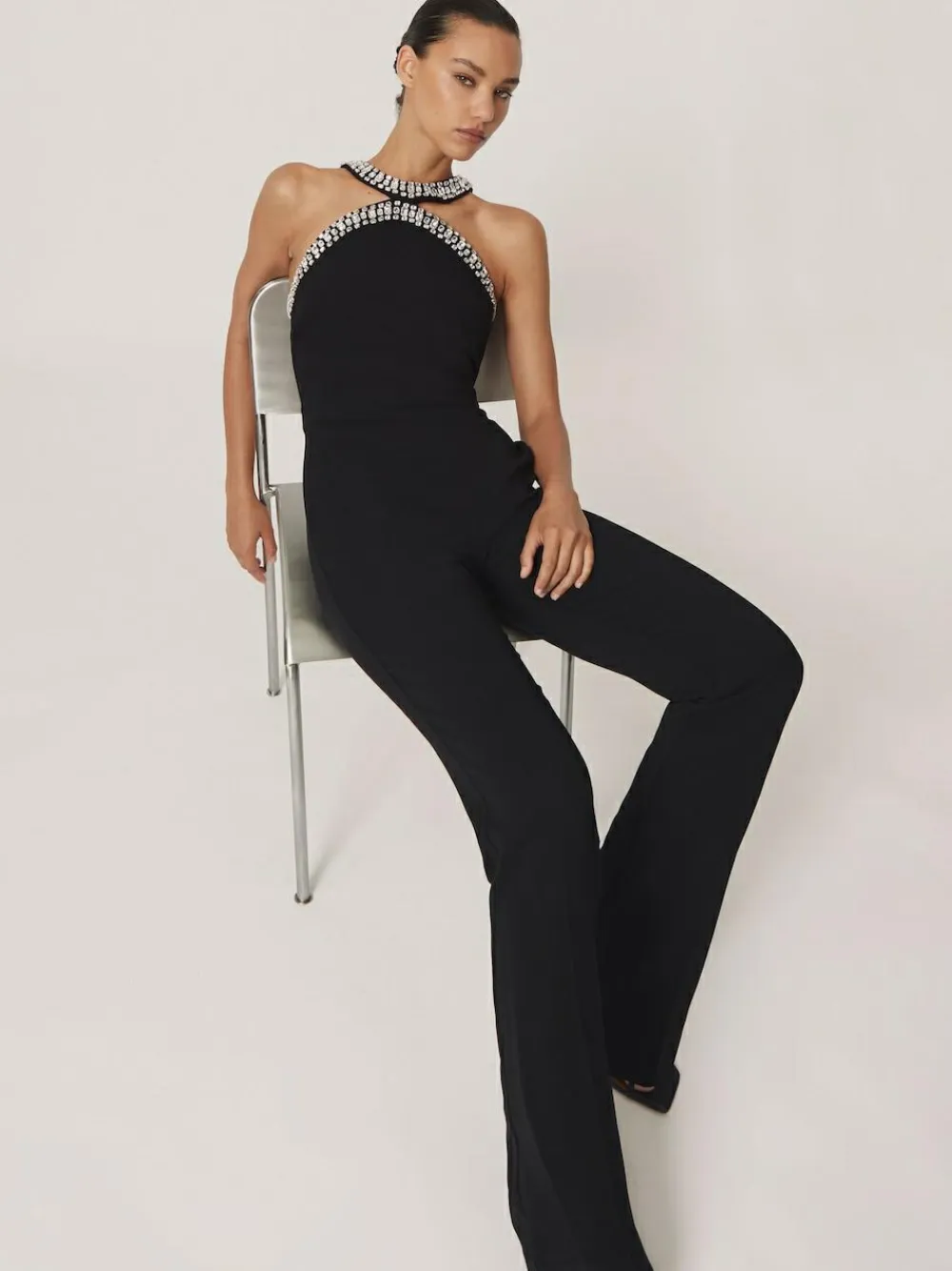 The black Simone jumpsuit is a statement piece designed for evening occasions. Large faceted crystals trace the cut-out collar and curved neckline, catching the light with every movement. The fitted bodice flows effortlessly into straight legs for a sleek, elongating silhouette. Woven fabric Crystal embellishment Collar detail Curved neckline Side slip pockets Concealed back zip The model is wearing a size 8 Measurements of model: 5ft8 / 178cm Regular inside leg length 32.5″ / 83cm. Dry clean only. 70% Acetate, 30% Polyester.