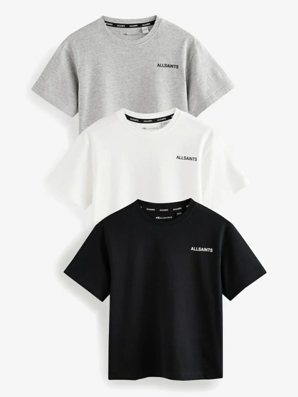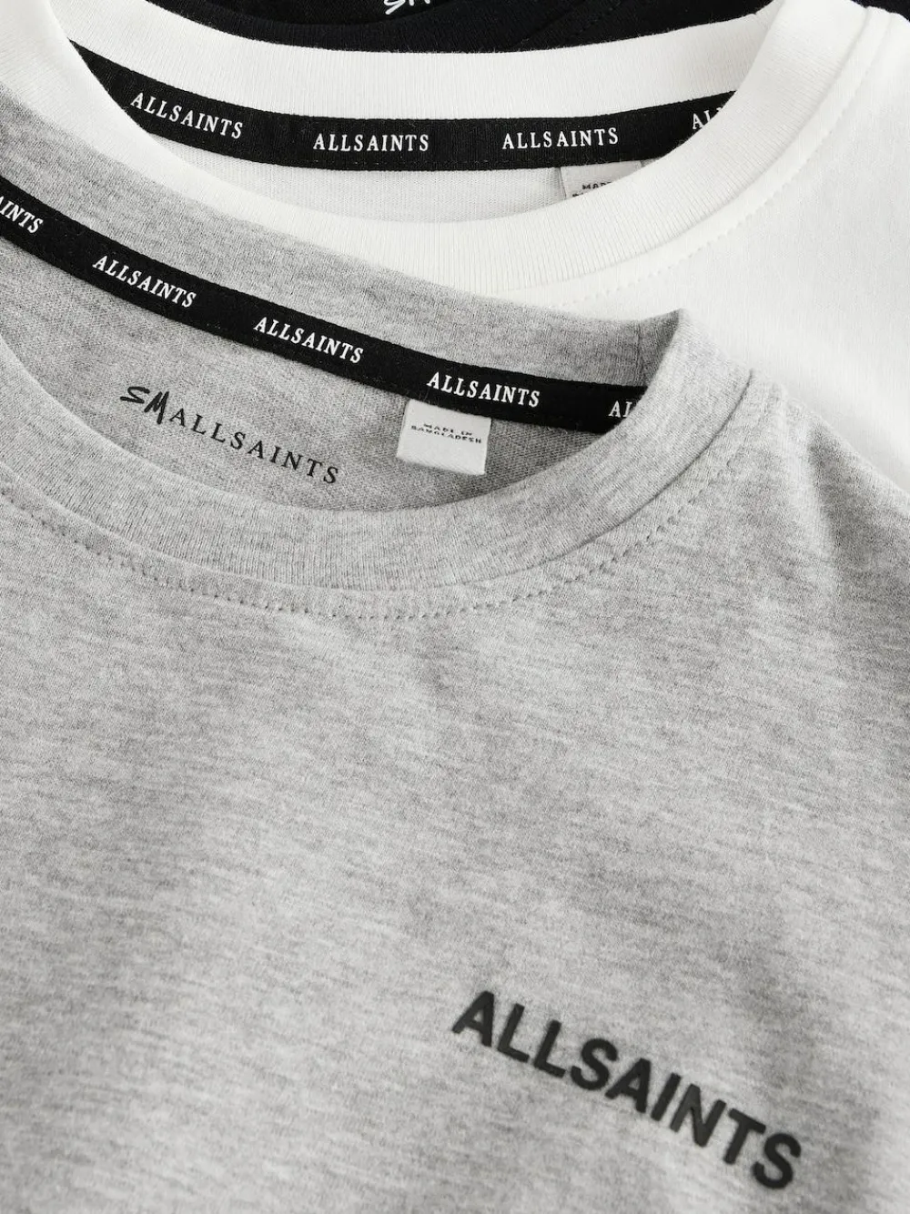 Take care of his everyday look with the smALLSAINTS t-shirt multipack. The pack contains three crew neck t-shirts crafted in soft cotton with a relaxed fit and dropped shoulders each in different colourways with the iconic AllSaints logo printed on the chest. Pair them with jeans and his favourite trainers for a great casual outfit. 3 pack AllSaints logo printed on chest Crew neck Short sleeve Relaxed fit Crafted from 100% cotton Machine washable. T-shirt Black and T-shirt White 100% Cotton. T-Shirt Grey 90% Cotton, 10% Viscose.