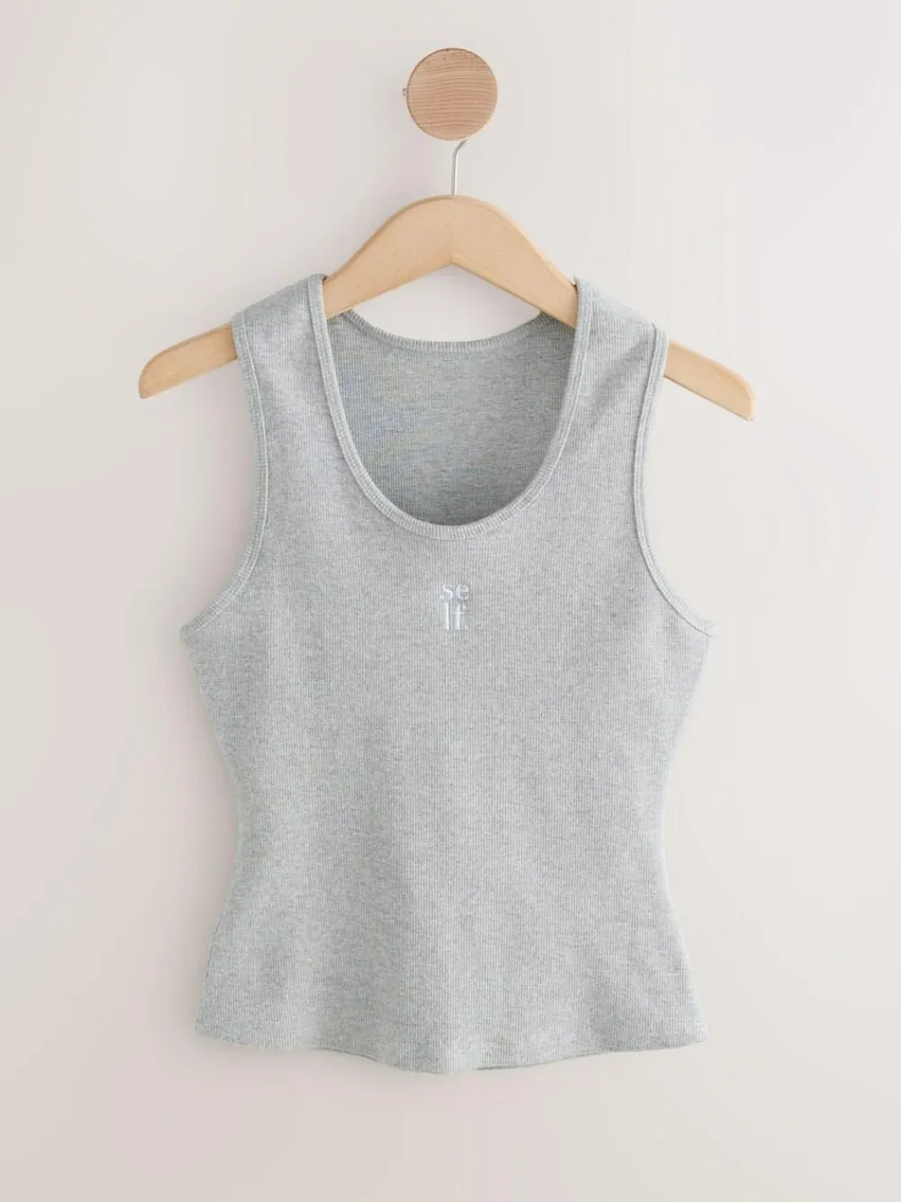 Build up your basics wardrobe with the self. rib scoop neck vest. The soft ribbed fabric sits close to the body and the added stretch means it holds its shape wear after wear. Designed a classic scoop neck with a slight racer back and self. embroidered logo detail to the centre front Ribbed Scoop neck Embroidered logo Machine washable. 89% Cotton, 7% Viscose, 4% Elastane.