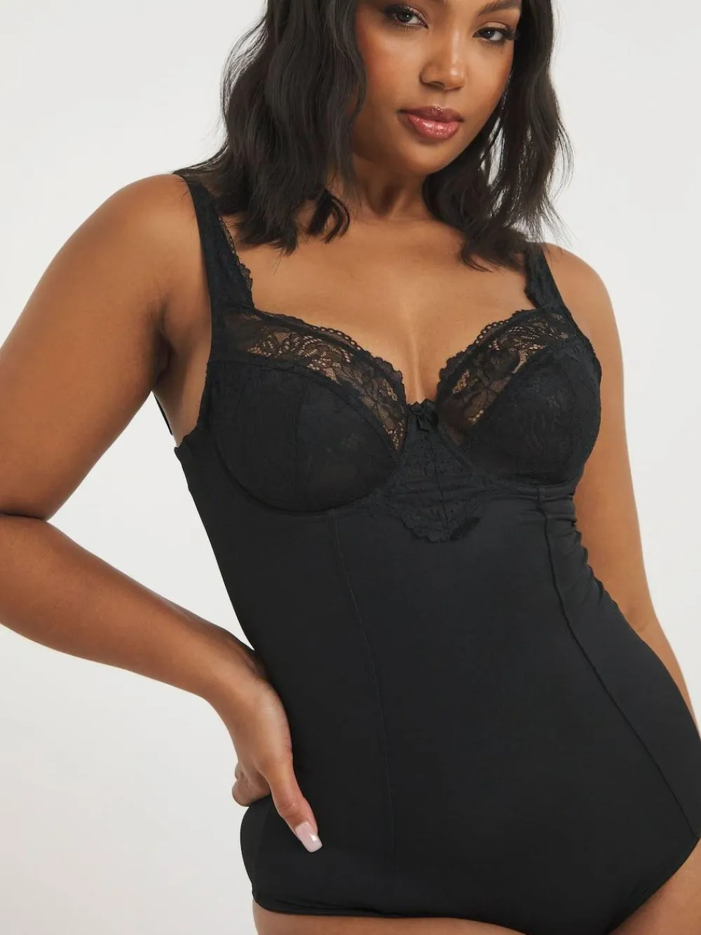 Based on our bestselling Ella lace full cup bra, this bodyshaper provides the same comfort but with a firm control shaping body to sculpt and shape your curves. The luxury lace panels, combined with the delicate centre front bow, give a beautifully feminine finish, whilst the non-padded, underwired cups keep you supported. With hook-and-eye fastening to the centre back, adjustable straps and popper fastening on the gusset. Shop the full Ella range to complete your look. Hand wash only. Main 75% Nylon, 22% Elastane, 3% Polyester. Gusset 100% Cotton.