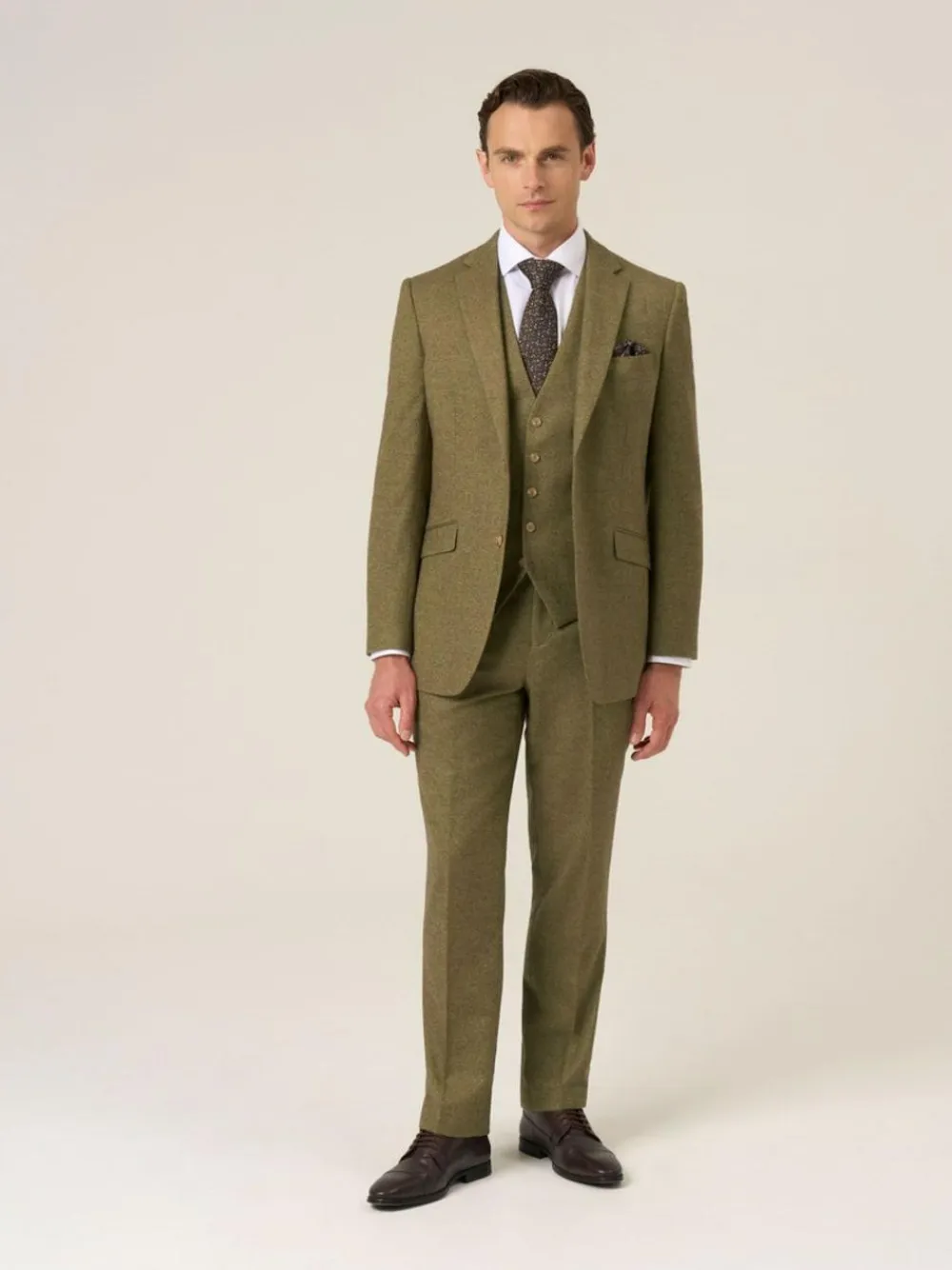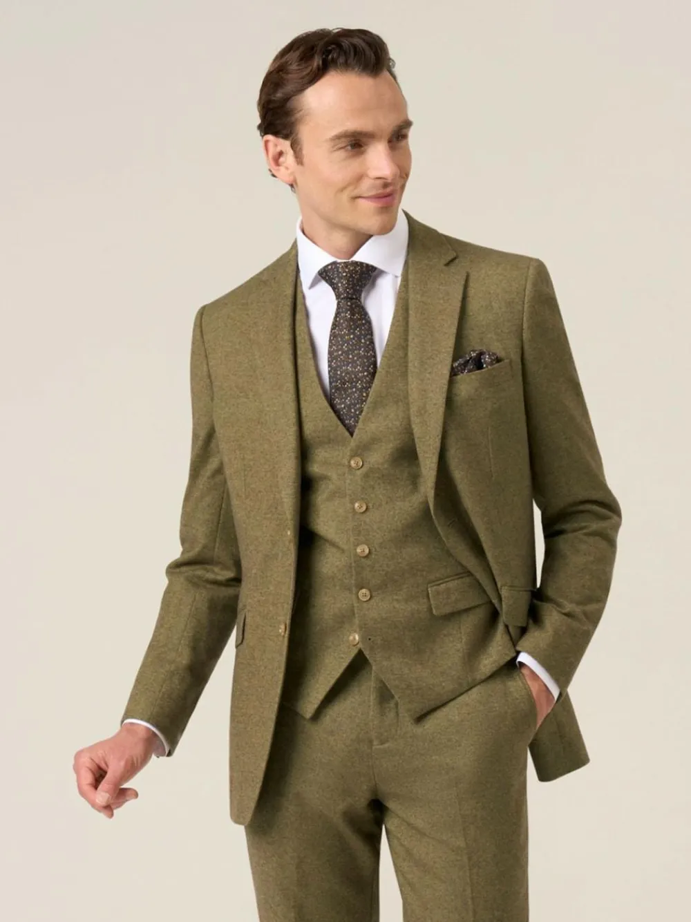 I’m Fox, a single-breasted, tailored suit jacket, made from a woven wool blend. I am a smoky charcoal grey with a tweed effect and perfect for any formal occasion you have in the colder months. My features include, slant flap pockets, horn effect buttons, geometric print lining with twin side vents. See my matching Fox tailored trousers and waistcoat. Dry clean only. 80% Polyester, 20% Wool.