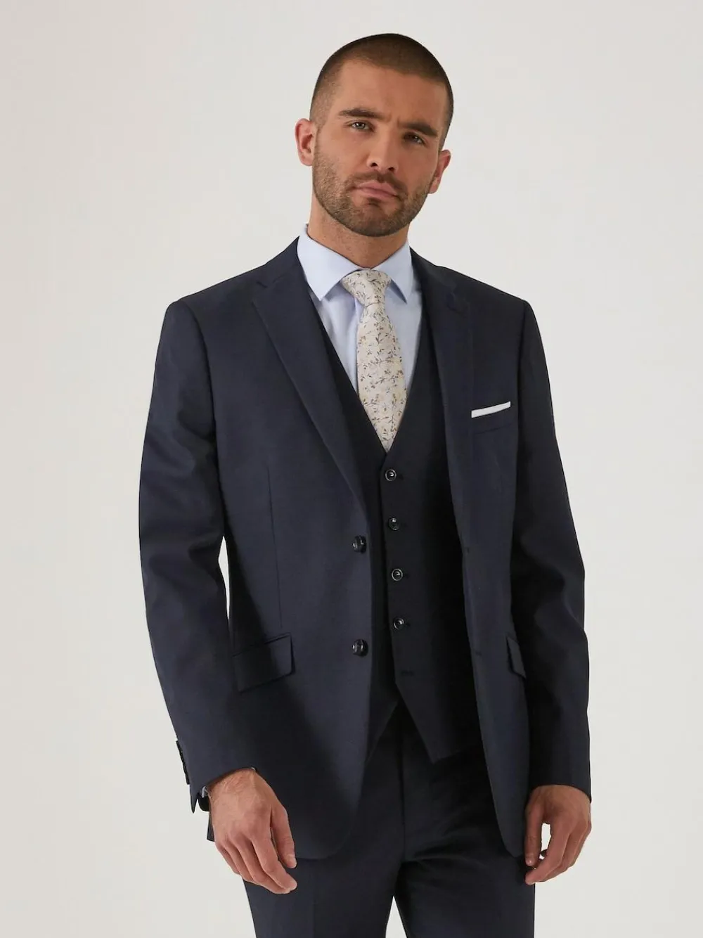 I’m Farnham, a tailored fit single-breasted suit jacket cut from a versatile crease-resistant cloth. My wool blend fabric and classic colour make me the ideal choice for a good first impression. My features include slant flap pockets, twin side vents and a contrast pattern lining. See my matching Farnham Tailored Fit Suit Trousers and Farnham Single-Breasted Suit Waistcoat to complete the look. Dry clean only. 72% Polyester, 28% Wool.