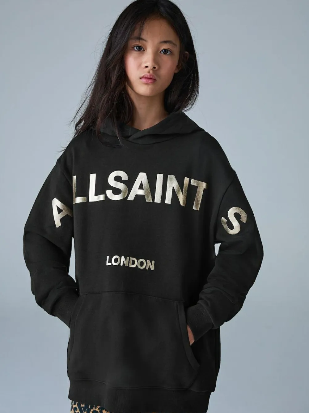 Check out this statement smALLSAINTS Black Gold Biggy Oversized Pullover Hoodie. This hoodie is the definition of cool and comfortable, crafted from soft 100% cotton and designed in an easy oversized fit. It features a bold, metallic Biggy AllSaints logo printed across the front in a striking gold finish. Practical features include a cosy hood, long sleeves and a convenient kangaroo pocket, making it an essential piece for everyday style. Biggy AllSaints logo Metallic print Kangaroo pocket Oversized fit Machine washable. Main 100% Cotton. Rib 95% Cotton, 5% Elastane. Lining 100% Cotton.