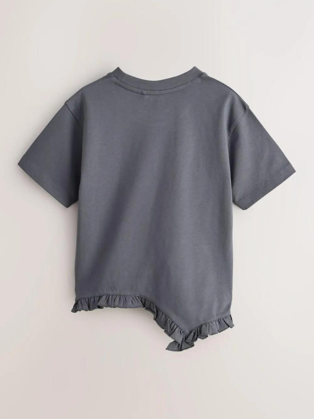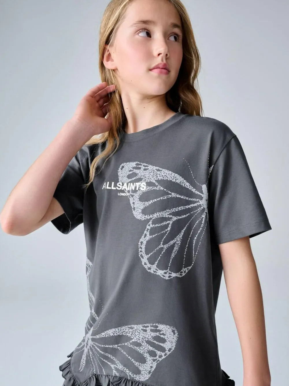 Refresh their casual rotation with the smALLSAINTS Charcoal Grey Asymmetric Hem Crew Neck Cotton T-Shirt. Crafted from 100% cotton for a soft and premium feel, this top features a striking butterfly graphic and the iconic AllSaints logo at the front. The design is defined by a unique frill asymmetric hem, which adds a playful, modern twist to the oversized, relaxed fit silhouette. Finished with a classic crew neck and short sleeves, this versatile piece is perfect for creating an effortlessly cool weekend look. Relaxed fit Frill asymmetric hem Butterfly graphic AllSaints logo at the front Machine washable. Main 100% Cotton. Neck 97% Cotton, 3% Elastane.