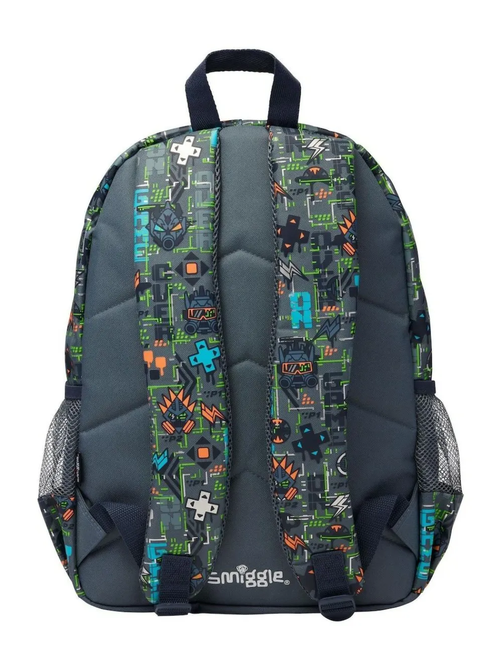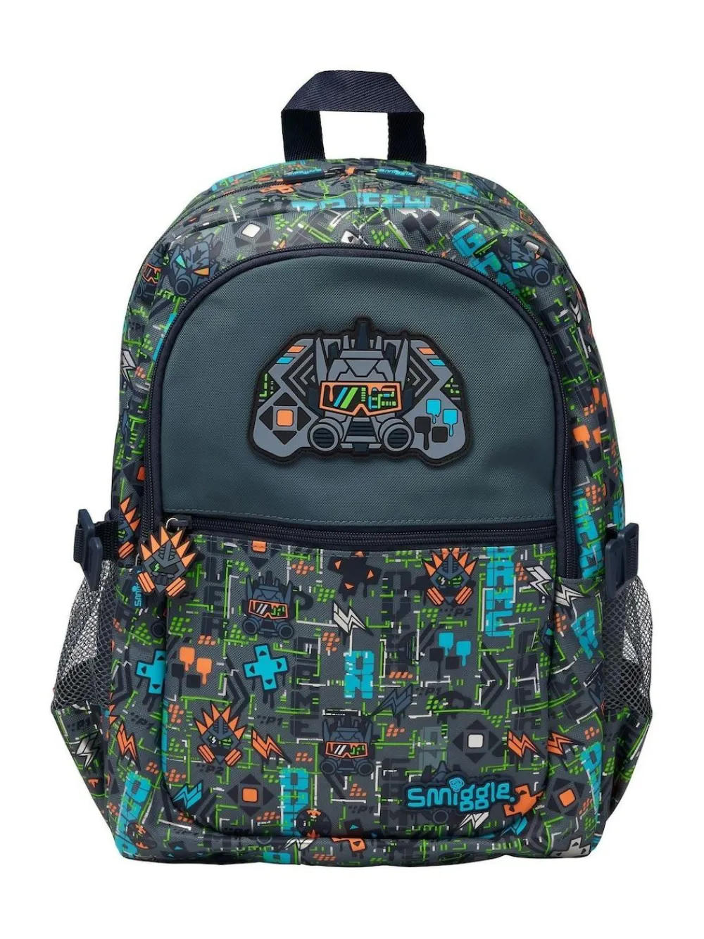 Calling all explorers, dreamers, and creative minds! Our Grey Trailblazer collection is ready to inspire Smigglers to make their mark in Smiggle style. Explore in Smiggle style with our Trailblazer Classic Attach Backpack! It has three zipped compartments to stash your stationery, tech, snacks, and more! Plus dual drink bottle sleeves and padded adjustable shoulder straps. It also has handy side clips that attach to our Trailblazer Square Attach Lunchbox for super easy lunch storage. Check out the extra design details, including character zips, a silicone badge, and graphic print! Attach the lunchbox to attach backpack. Three zipped compartments – main compartment with double zip Dual drink bottle sleeves Padded adjustable shoulder straps Carry Handle 15-inch laptop compartment Internal name label print placement may vary Height 42cm Width 30cm Depth 13cm 45% Polyester, 45% PVC, 10% PU.