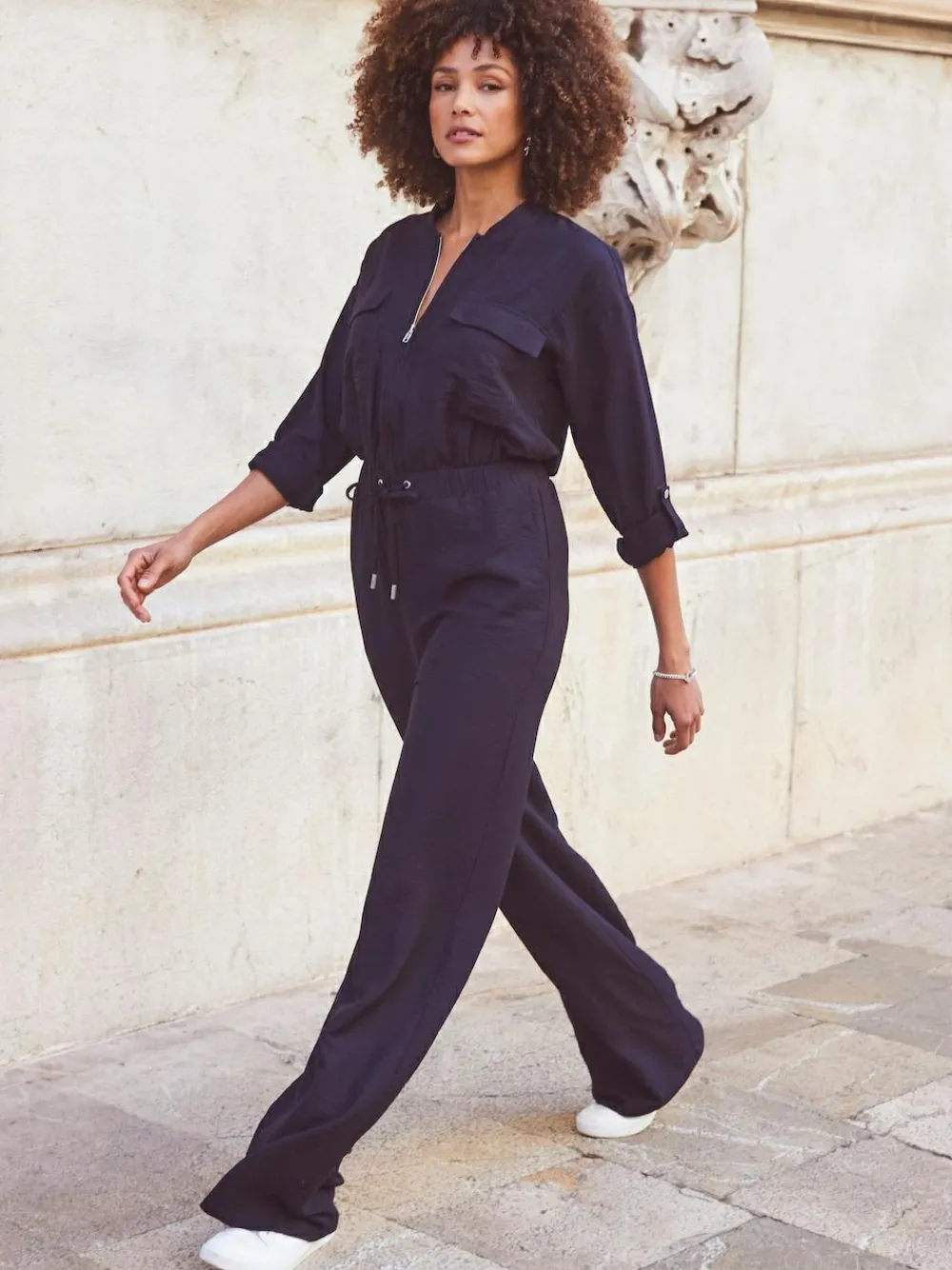 The definition of effortless dressing, crafted from soft and drapey fabric, wide legs, elasticated waist – jumpsuits don’t get comfier, framed by a chic zip front neckline, trending utility pockets, and tab detail sleeves, just add your favourite trainers. Inside leg to fit: short 29″ | regular 31″ | long 33″. The model is 5ft 9” and wears a UK size 8. Machine washable. Main 80% Viscose, 20% Elastane. Lining 95% Polyester, 5% Elastane.