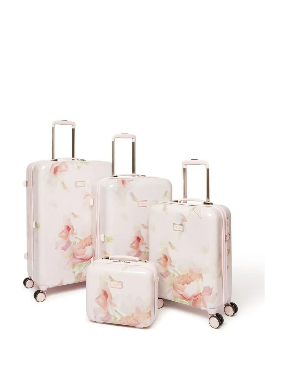 A fresh floral moment designed for the understated statement maker. Magnola Bloom luggage collection by Ted Baker is fine, feminine, and full of presence. Finished with Ted Baker’s signature gold details and a sculpted, structured form, this 4-piece travel collection includes a Vanity Case, Cabin, Medium, and Large Suitcase. Details include a signature print lining with organised interior to make packing easy, an embedded TSA lock and double wheels with branded wheel caps. Height 68cm Width 45cm Depth 28cm 100% ABS (Acrylonitrile Butadiene Styrene).