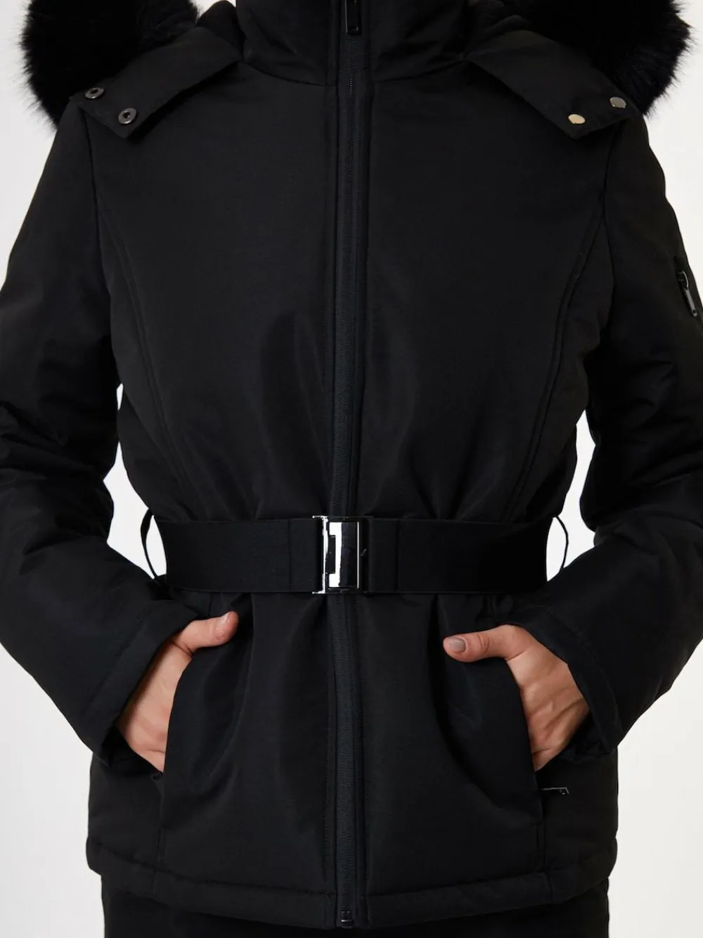 Stay warm and stylish on the slopes with this ski jacket, designed for ultimate comfort and performance. This ski coat features sheet padding and a microfleece-lined body and hood, offering cosy insulation. The full zip with storm guard and a chin guard has snap fastening ensuring added protection, while the stretchy waist belt with a metal buckle enhances the fit. A 4-piece hood with detachable faux fur trim and ribbed storm cuffs will keep out the cold. With two outer zip pockets, a zip arm pocket, an inner welt pocket, and an inner snow skirt with an elasticated hem band, this coat is perfect for all your skiing needs. Fleece lined inner body and hood. Storm guard and storm cuffs. detachable faux fur hood. 2 x outer zip pockets. 1x zip arm pocket for ski pass. Inner welt pocket. Inner snow skirt and elasticated hem band. Model wears UK size 8. Machine washable. Outer 100% Polyester. Lining 100% Polyester. Filling 100% Polyester.