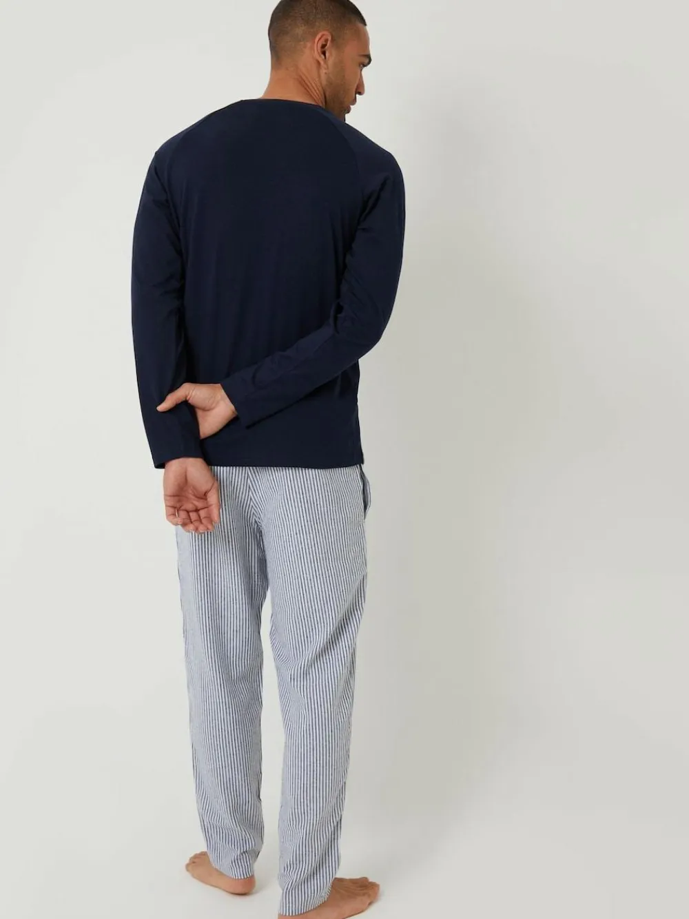 Get a good night s sleep in this long pyjama set from Threadbare. 2-piece set. Long sleeve top. Embroidery on chest. Ribbed crew neck. Brushed stripe bottoms with elasticated waistband and drawcords. Side entry pockets. Model wears UK size M. Machine washable. Main 60% Cotton, 40% Polyester. Bottom 100% Cotton.
