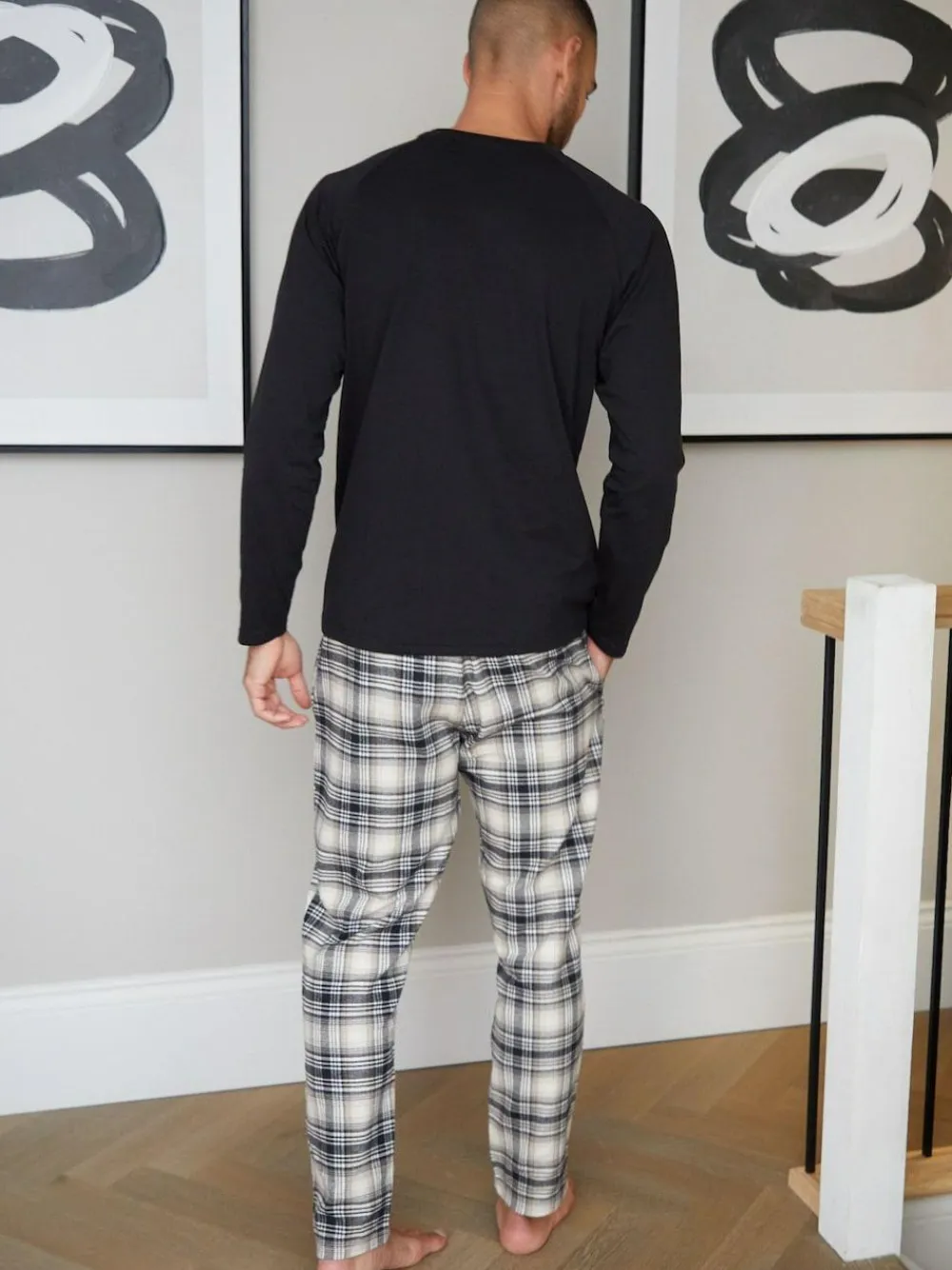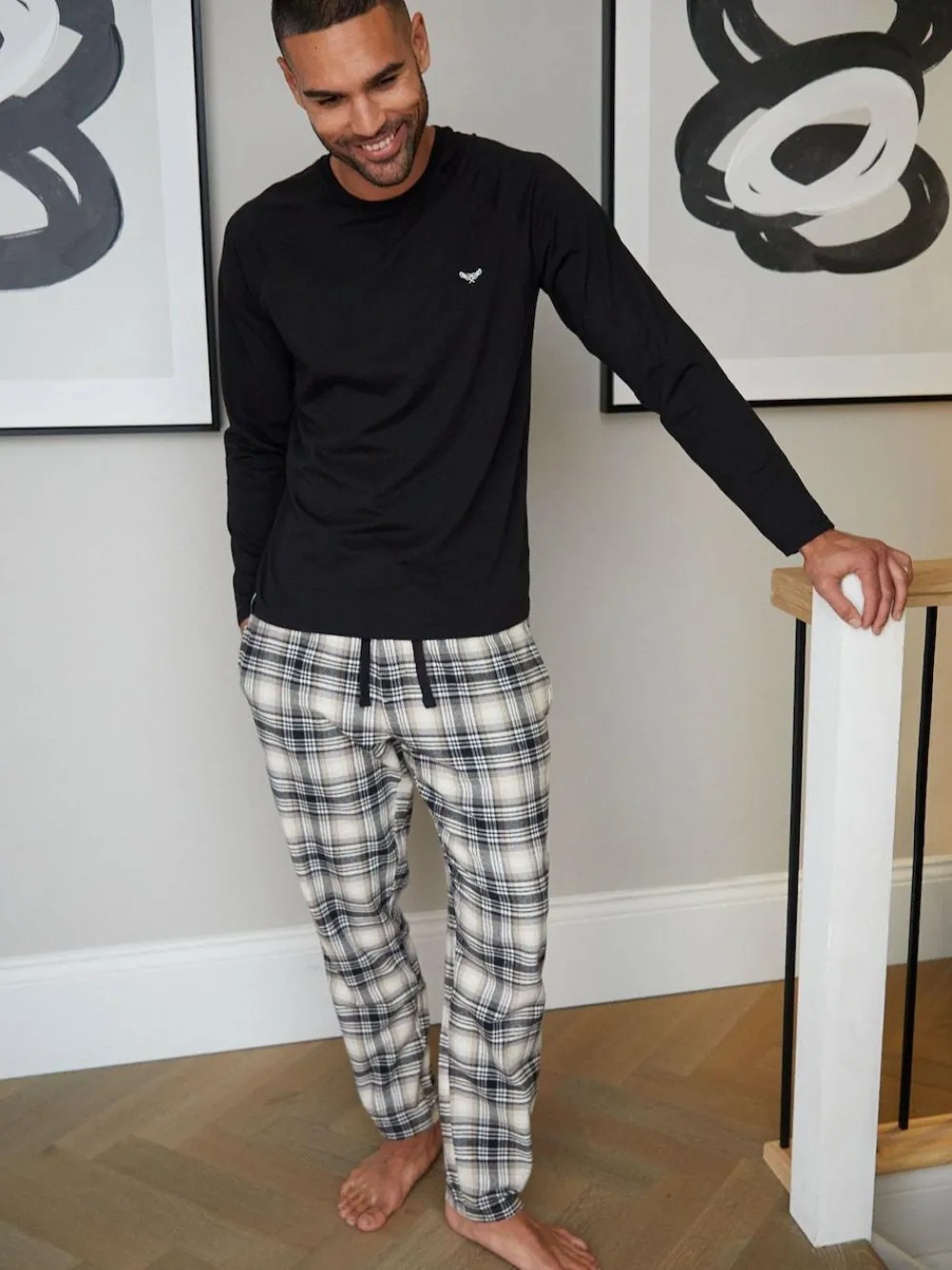 Lounge in comfort with this pyjama set from Threadbare. This set contains a long sleeve t-shirt with raglan sleeves and Threadbare embroidery on the chest, and long brushed cotton check flannel bottoms with elasticated waistband, drawcords and side entry pockets. Perfect for lounging about the house or for sleeping in. Machine washable. 60% Cotton, 40% Polyester. Warning: Keep away from fire and flames.