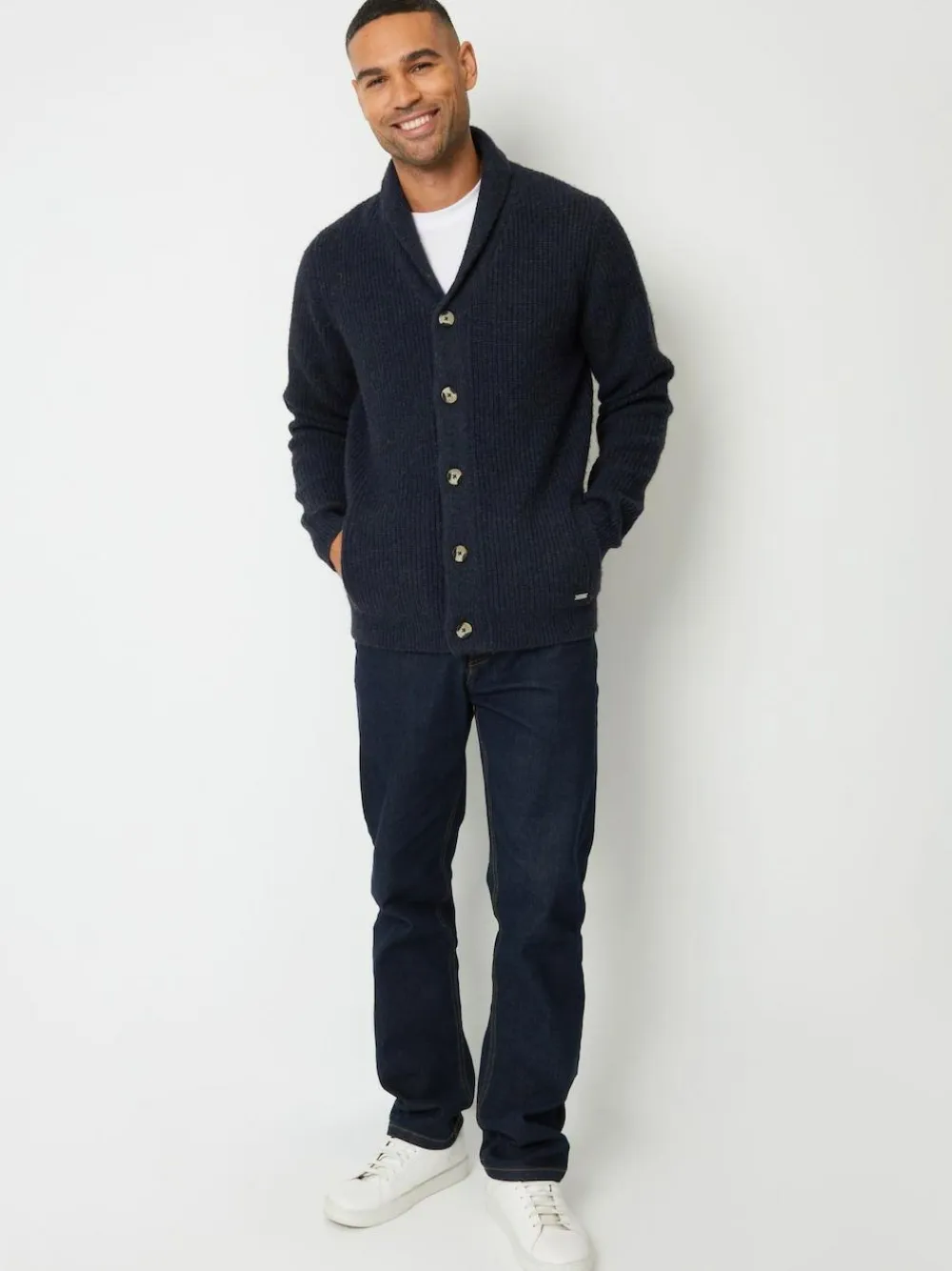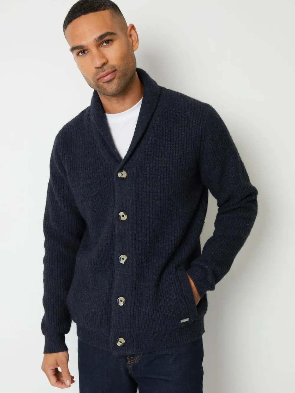 Upgrade your knitwear with heavier weight knitted cardigan from Threadbare. With a stylish shawl collar and in an all-over half cardigan knit, this raglan sleeve style knitted cardigan has two pockets, ribbed cuffs and hem for comfort and a full mock horn button-down fastening. A great piece to have on hand for layering when the temperature drops. Pair with dark denim jeans and layer over a white tee for a stylish casual look. Machine washable. 81% Polyester, 7% Acrylic, 7% Nylon, 5% Wool.
