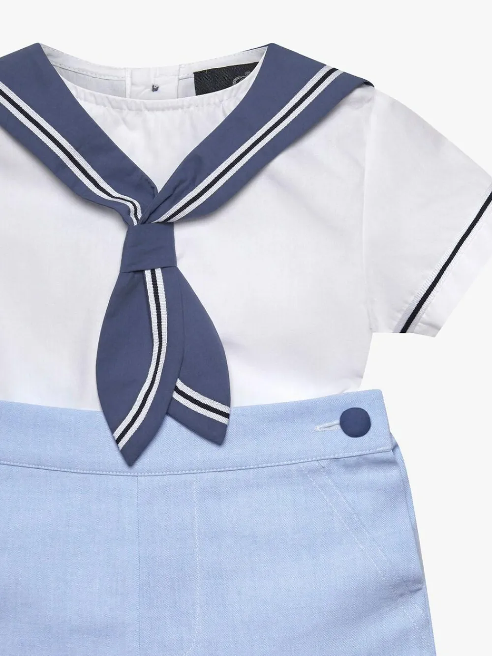 This woven set is made in a classic blue chambray and features smart nautical details. Designed with weddings, special occasions in mind, the short-sleeved shirt neatly fastens via concealed buttons to a classic pair of shorts, complete with button detailing down the back. Machine washable. 100% Cotton.