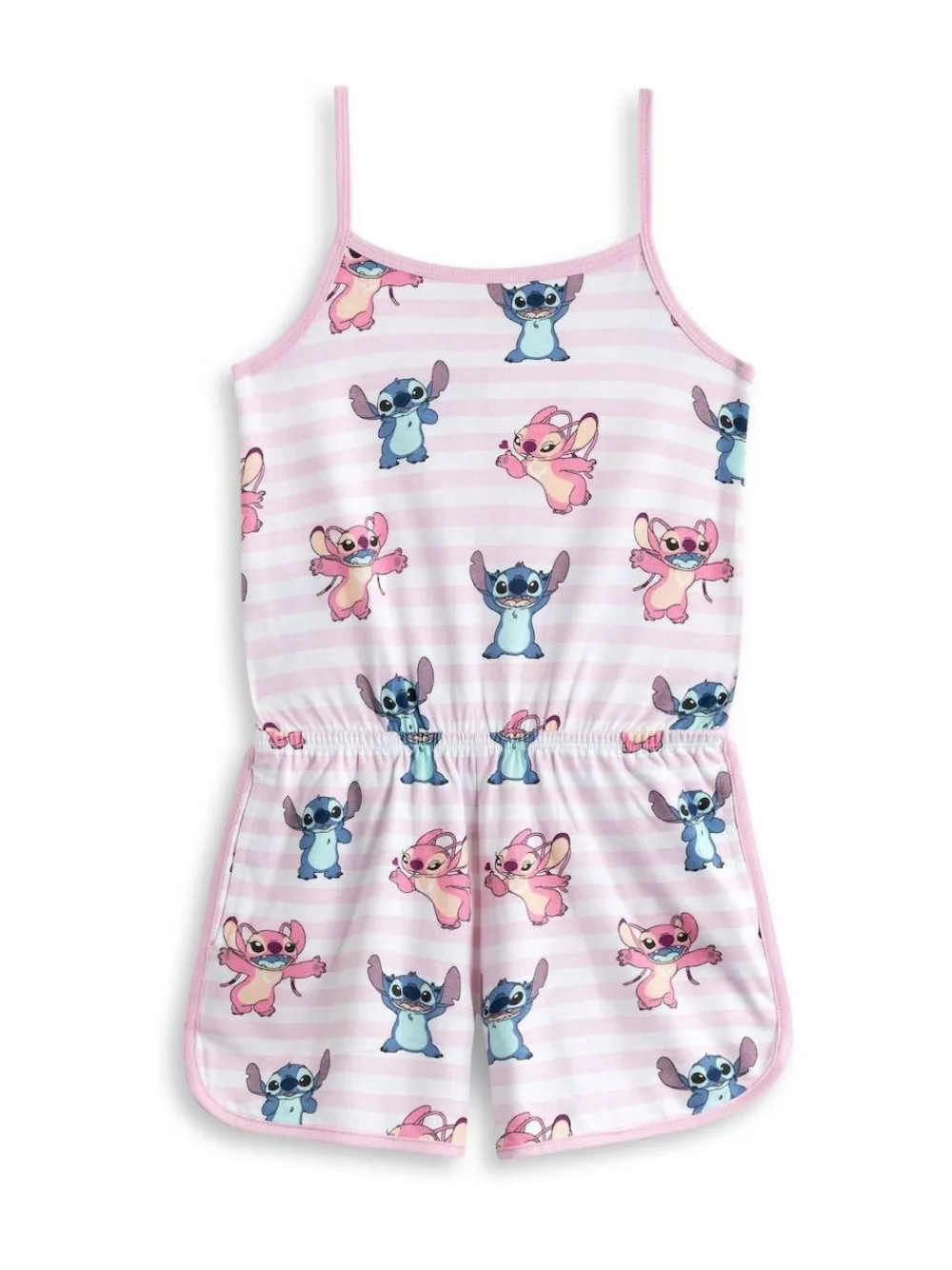 Introducing the Disney Lilo & Stitch Girls Pink Multi Character AOP Sleeveless Playsuit. Perfect for playful adventures, this charming outfit features beloved characters in a delightful pink design. Machine washable. 100% Cotton. Warning: Keep away from fire and flames.