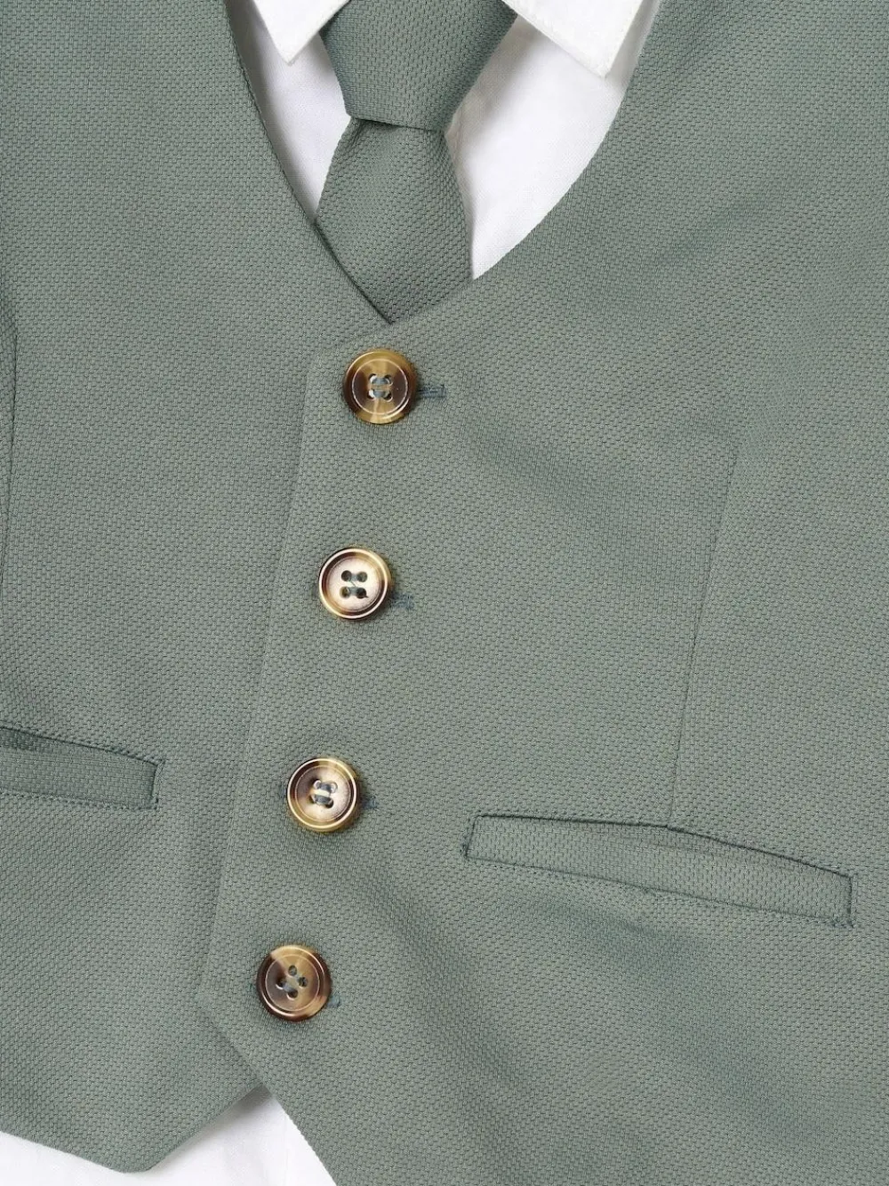 Your little man will steal the spotlight in our stylish three-piece occasion set—featuring a soft green textured waistcoat, crisp white shirt, and smart tie. Pair with the matching trousers or shorts for a picture-perfect finish. Machine washable. Main 100% Polyester. Lining 100% Cotton.