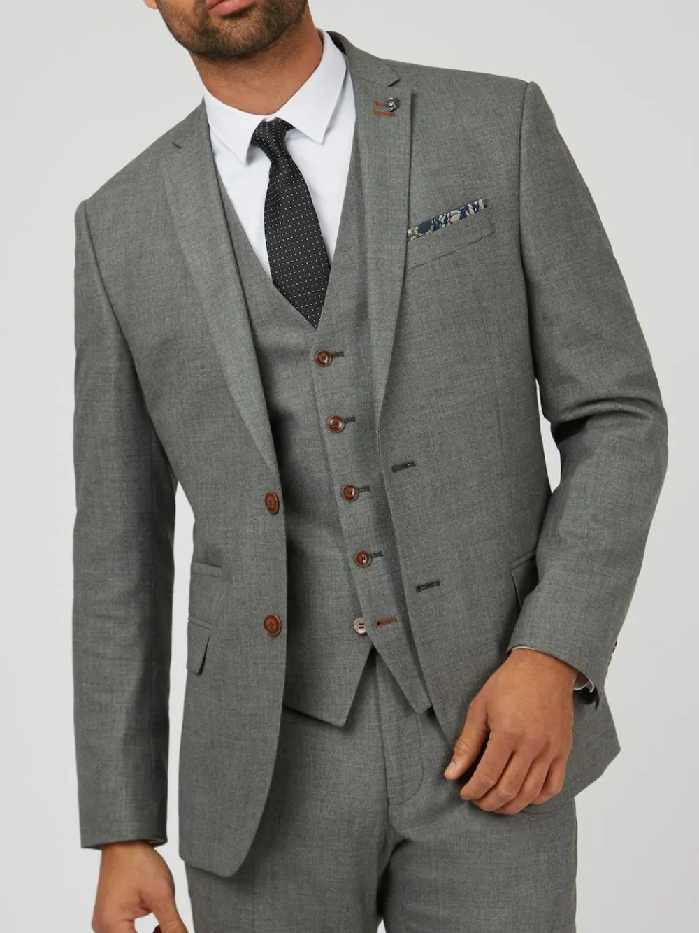 Single breasted two button front slim fit jacket with a notch lapel and three button cuff. Style with matching trouser and waistcoat. Dry clean only. 66% Polyester, 31% Viscose, 3% Elastane.