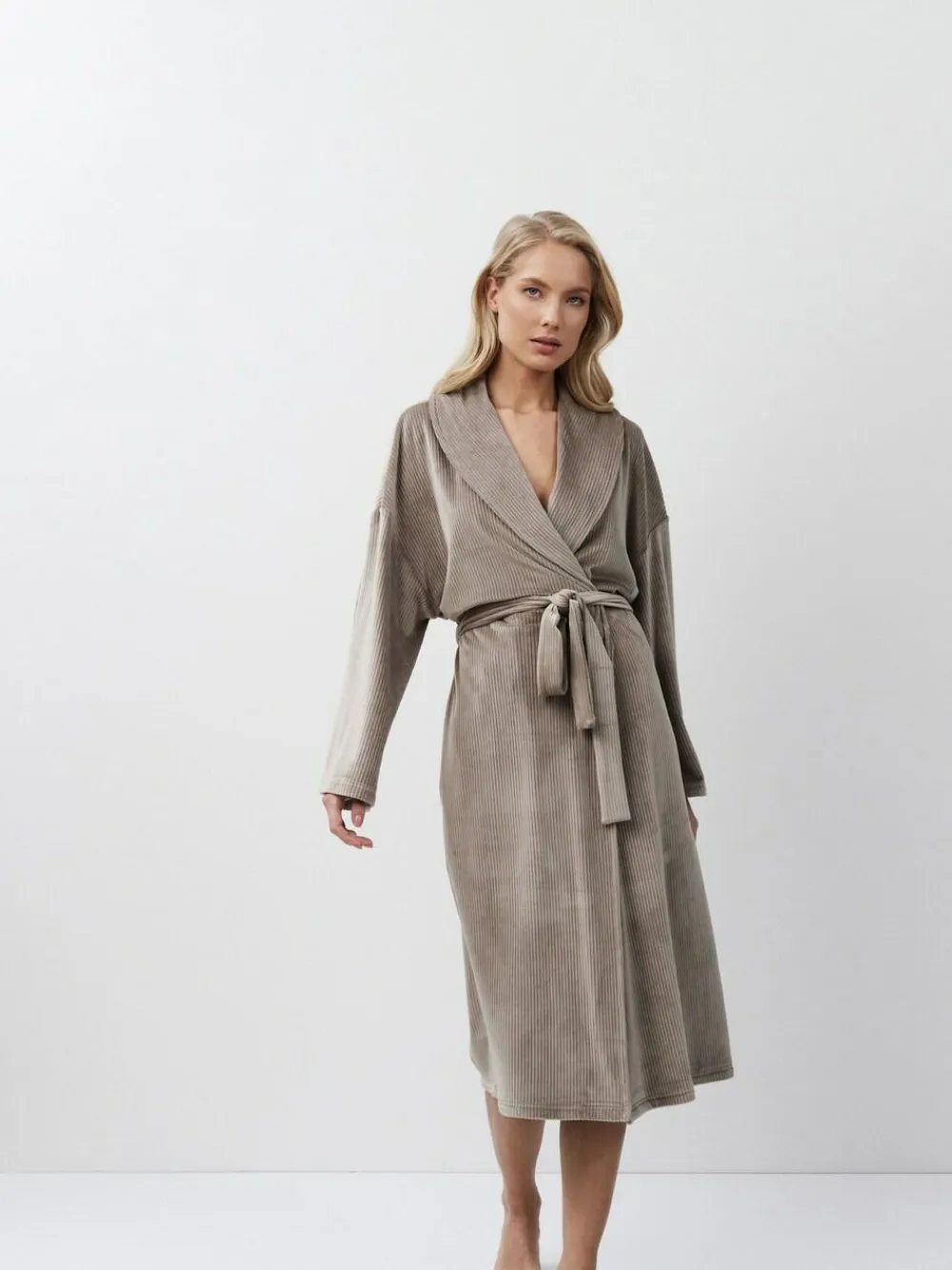 Luxurious, long bathrobe with a super soft ribbed texture in a soft muted Taupe Brown colour. Features full-length sleeves with low cuffs. Hidden side pockets for a sleek look. Tied with a belt. Designed to fall below the knee. Washable. 95% Polyester, 5% Elastane.