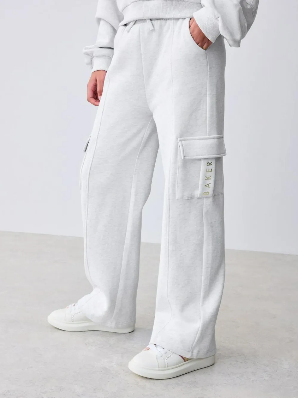 Elevate their casual wardrobe with the perfect blend of comfort and street style. This two-piece cargo co-ord set from Baker by Ted Baker features a super-soft light grey marl fabric that is ideal for all-day wear.The cropped hoodie boasts a relaxed fit and is accented by a subtle, embroidered two-toned and metallic Baker branding across the chest, echoing the sophisticated shield and bow branding on the back hood. The coordinating wide-leg cargo trousers offer a fashion-forward look with a comfortable elasticated drawstring waist with branded eyelets and drawcords, and practical side cargo pockets, which feature our metallic branding detail. Finished with central seams for a clean structure, this set is a must-have for the stylish trendsetter who values both comfort and premium design. Hoodie and Jogger 70% Cotton, 30% Recycled polyester.