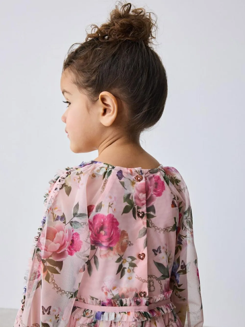 Bring a touch of charm to her wardrobe with this gorgeous floral dress from Baker by Ted Baker. Crafted from a delicate light pink chiffon fabric, the dress showcases a beautiful all-over print featuring lush florals, and ruffled tiers. This dress features sheer sleeves finished with grosgrain tape detailing, with multiple cascading tiered ruffles on each tier of the skirt complimented with grosgrain bows. Finishing details include our Baker branded heart buttons in rose gold at the back for a comfortable and easy closure. This dress is the perfect blend of pretty and practical for parties and sunny-day fun. Shell 100% Polyester. Inner Lining 100% Polyester. Main Lining 100% Cotton.