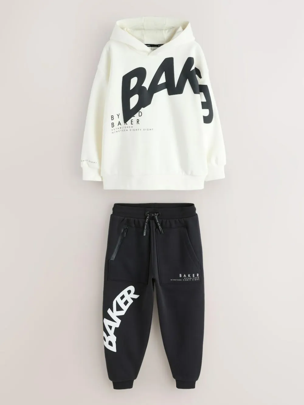 Upgrade his casual wardrobe with the Baker by Ted Baker Oversized Graphic Hoodie and Joggers Set, a premium two-piece ensemble designed for both comfort and a bold designer look. This coordinated set features a relaxed, oversized hoodie with a striking printed puff print branding that sweeps across the front and onto the arm for high-impact style. The matching joggers are crafted for functionality and a custom fit, boasting an elasticated waistband with branded eyelets and drawcords. They are equipped with a side pocket with a branded zip on one side and an open pocket on the other, all finished with matching graphic branding down the leg to complete the signature Baker aesthetic. 2 piece set Branded puff print Branded eyelets and drawcords Hoodie and Jogger Main 82% Cotton, 18% Polyester. Rib 99% Cotton, 1% Elastane.