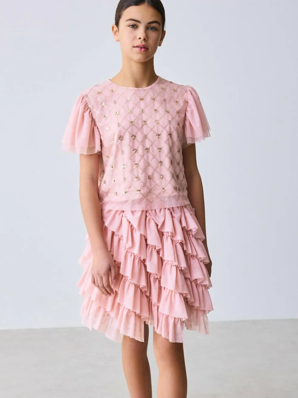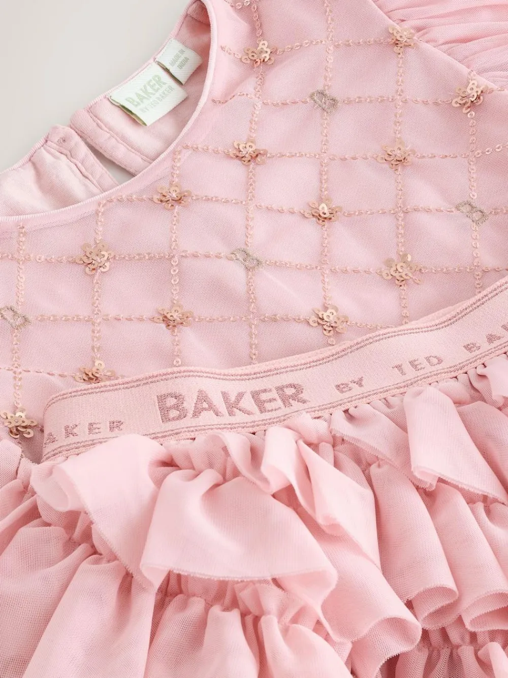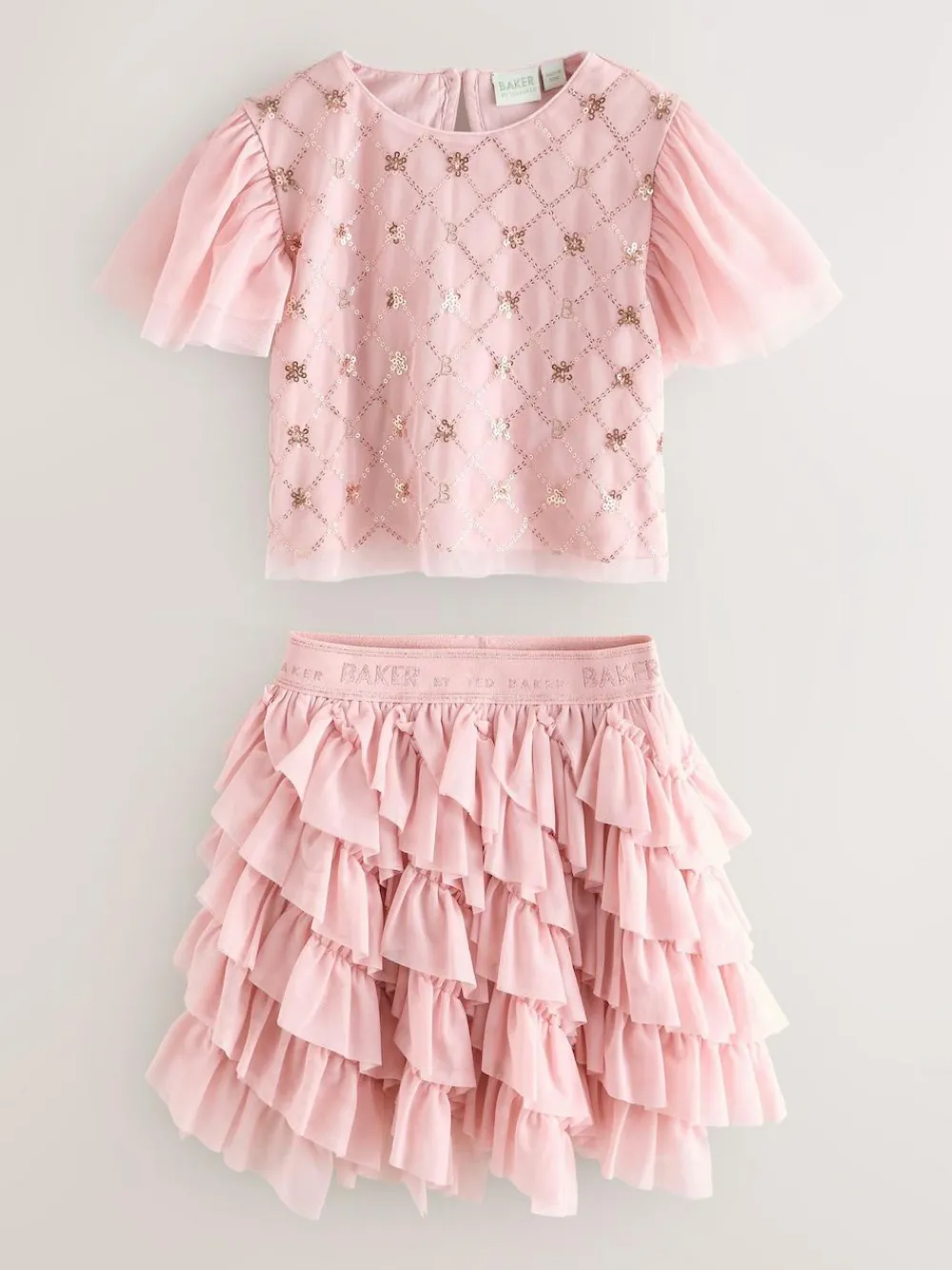 Bring some sparkle to her wardrobe with this dazzling two-piece set from Baker by Ted Baker. Both pieces are presented in a gorgeous, delicate blush pink and exaggerate stunning mesh layers. The cropped top is crafted with a sheer mesh overlay and is intricately decorated with a geometric trellis of our B motif design in shimmering gold sequins. The top is finished with charming layered angel sleeves. The coordinating skirt boasts multiple cascading, tightly ruched tulle ruffles that create sensational volume and movement. Featured with our contrasting Baker branded elastic waistband in a pnk lurex thread, ensuring a comfortable fit and an extra touch of sparkle. This set is perfect for parties, celebrations, or mixing and matching with other wardrobe favourites. Crop Top and Skirt Shell 100% Polyester. Lining 100% Cotton.